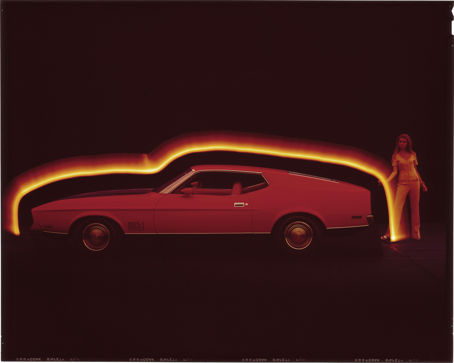 View of a woman posing with a 1971 Ford Mustang coupe. Label on sleeve: "Ford Motor Co., Ford Mustang, 1971."