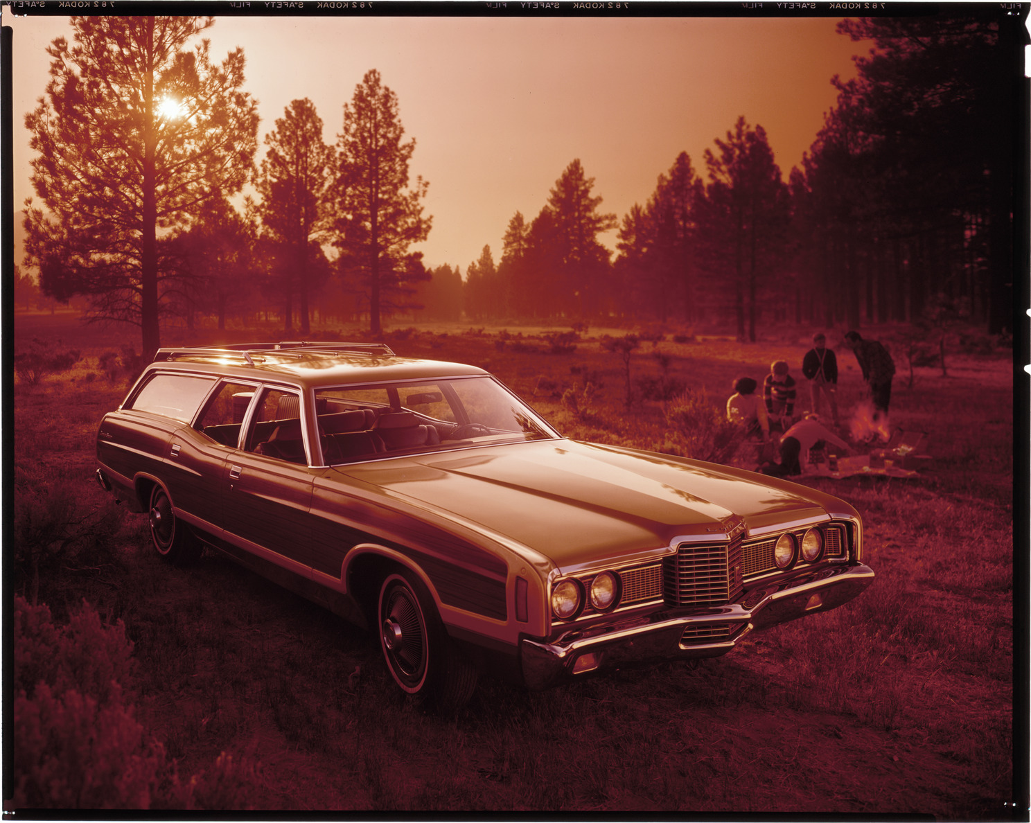 View of a 1972 Ford Country Squire station wagon. Family sits around campfire in background. Label on sleeve: "Ford Motor Co., Ford wagon, 1972."