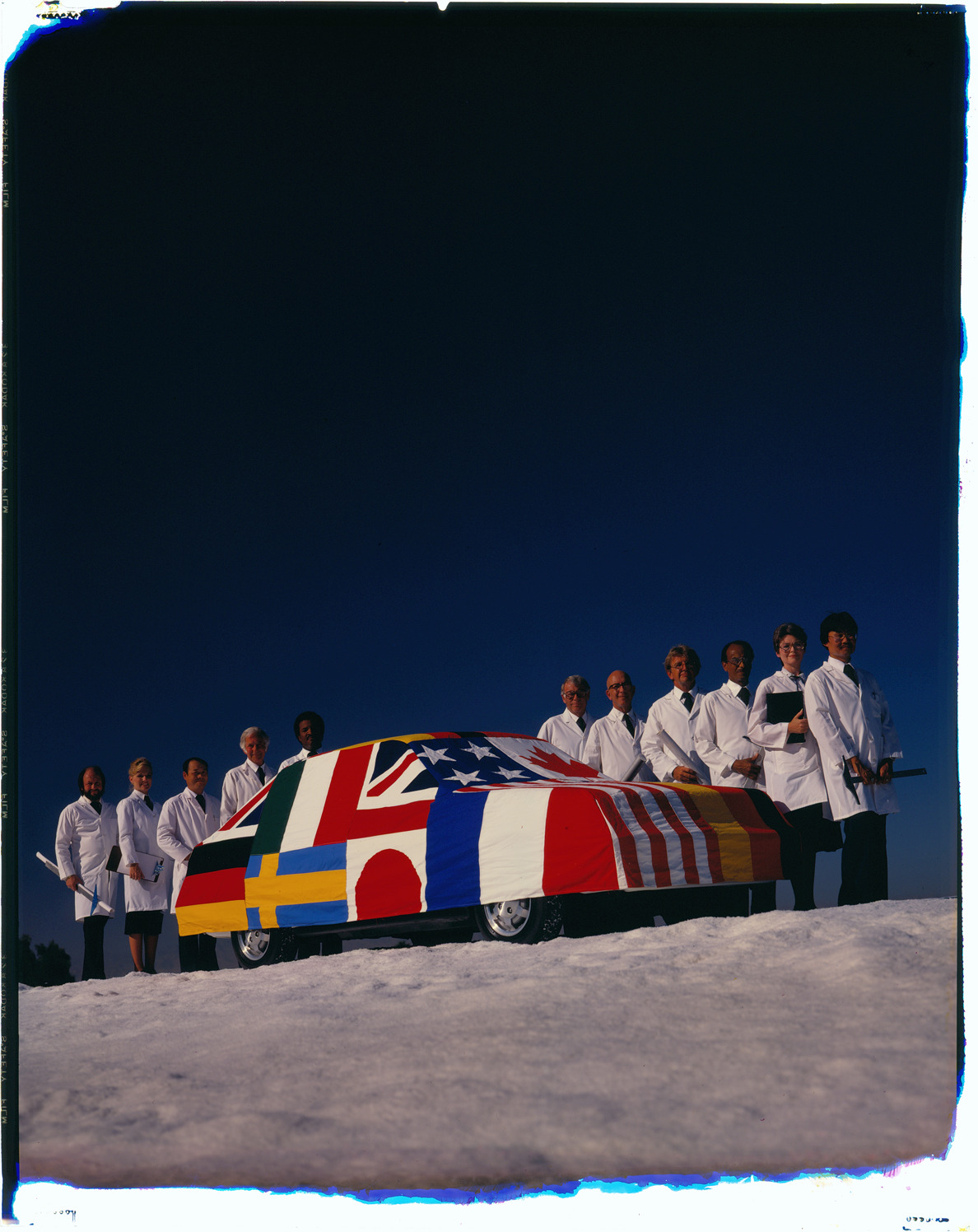 Favorite this☆ Advertisement for 1981 Ford Escort automobile Description: View of men and women, wearing lab coats, posing with a 1981 Ford Escort, which is covered with international flags. Label on sleeve: "Ford Motor Co., Ford Escort advertising, 1981." Details Resource ID: na035242 Creator: Boulevard Photographic (Firm) Subject: Escort automobile Advertising--Automobiles Transparencies Date Issued: 1981 Format: 1 transparency : col. ; 10 x 8 in. Member of: National Automotive History Collection Mickey McGuire and Jim Northmore Boulevard Photographic Collection Filing Location: Ford, 8:1 Rights: Physical rights are retained by DPL. Copyright is retained in accordance with U.S. copyright laws.