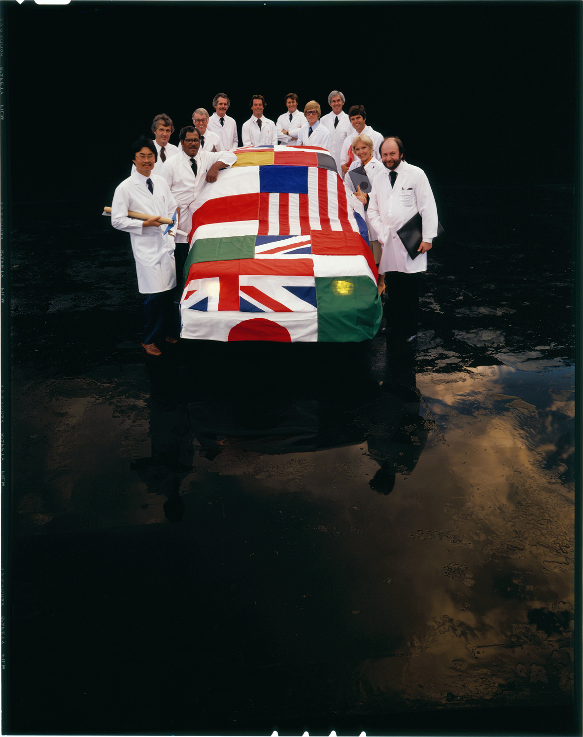 View of men and women, wearing lab coats, posing with a 1981 Ford Escort, which is covered with international flags. Label on sleeve: "Ford Motor Co., Ford Escort advertising, 1981."