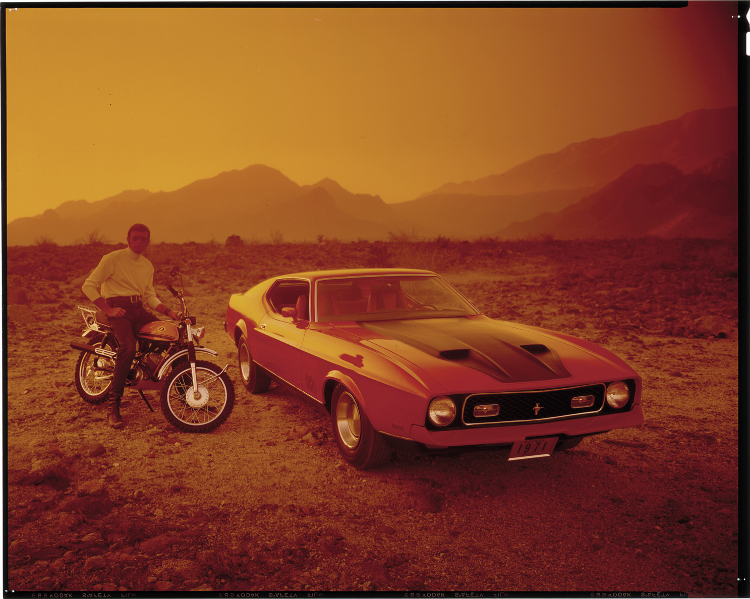 View of a 1971 Ford Mustang coupe. Man poses on motorcycle next to car. Label on sleeve: "Ford Motor Co., Ford Mustang, 1971."