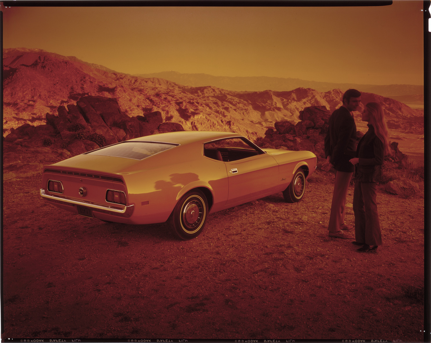 View of a man and woman posing with a 1971 Ford Mustang coupe. Label on sleeve: "Ford Motor Co., Ford Mustang, 1971."