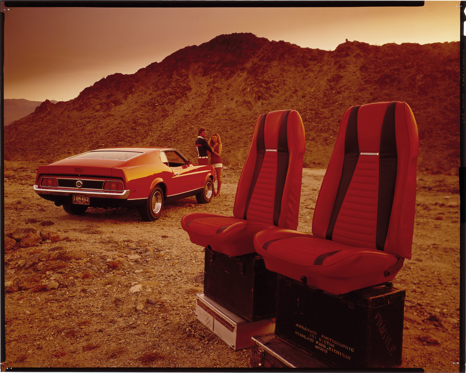 View of a man and woman posing with a Ford Mustang coupe. Seats are displayed in foreground. Label on sleeve: "Ford Motor Co., Ford Mustang, 1971-72."