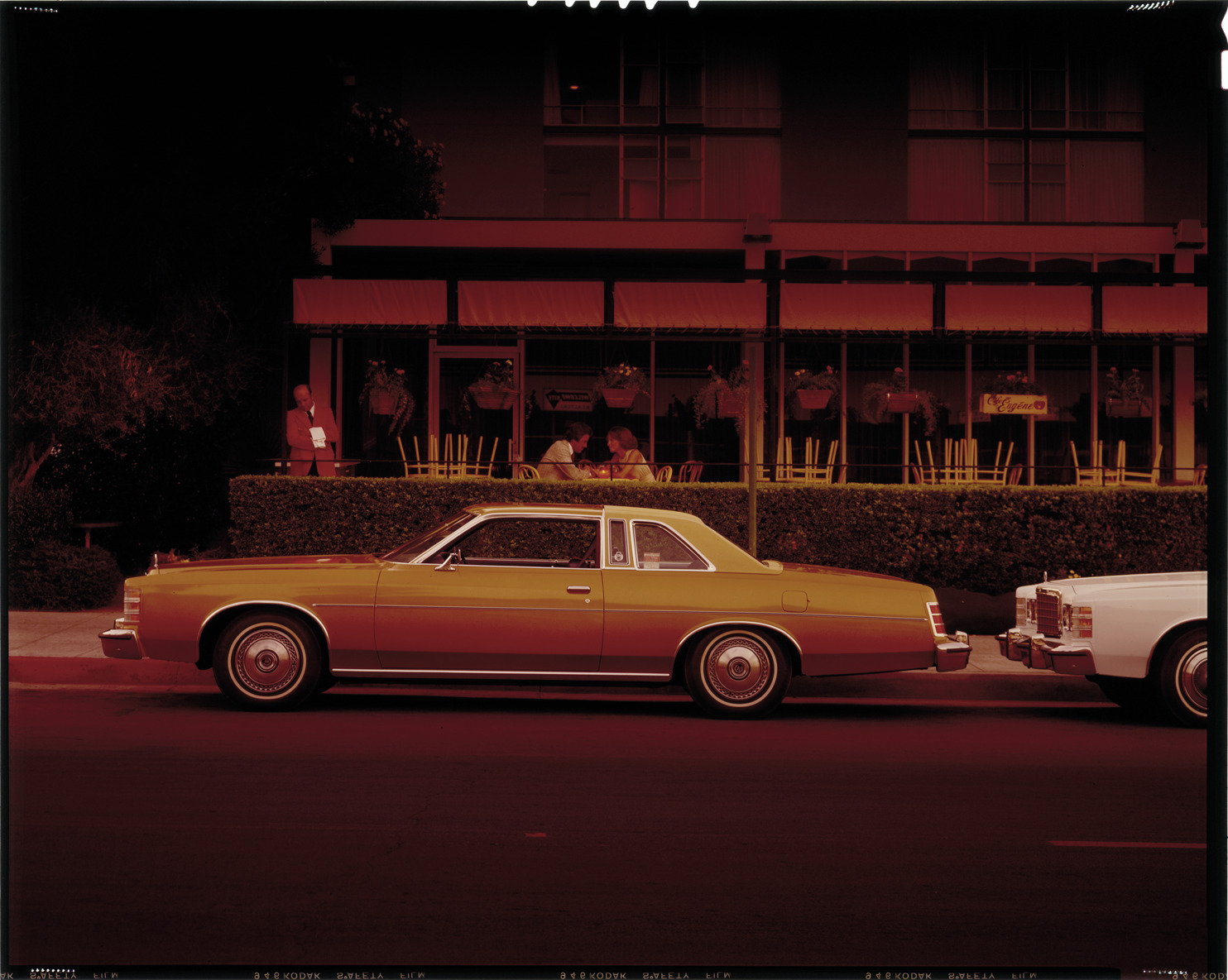 View of a Ford LTD coupe. Waiter and couple in outdoor restaurant in background. Label on sleeve: "Ford Motor Co., Ford, 1975-77."