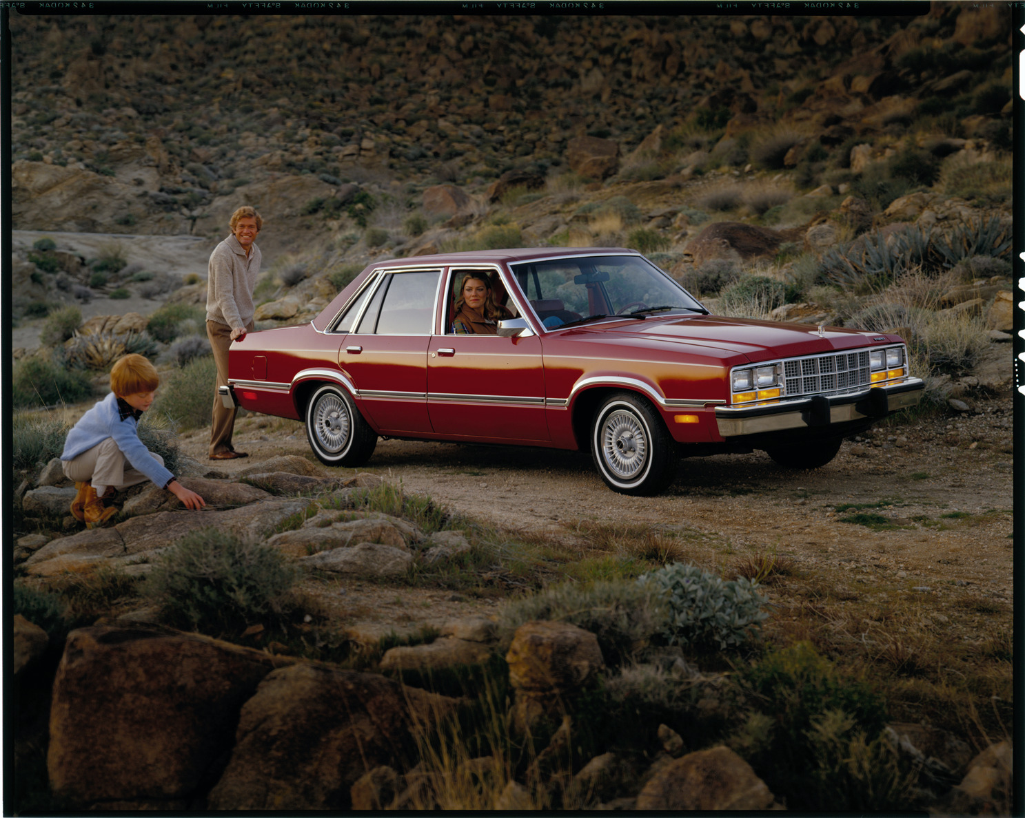 View of a family posing with a Ford Fairmont sedan. Label on sleeve: "Ford Motor Co., Ford Fairmont, 1978-80."