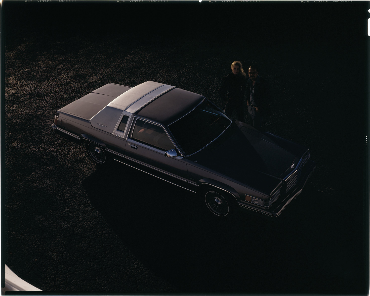 View of a man and woman posing with a 1980 Ford Thunderbird coupe. Label on sleeve: "Ford Motor Co., Ford Thunderbird, 1980."