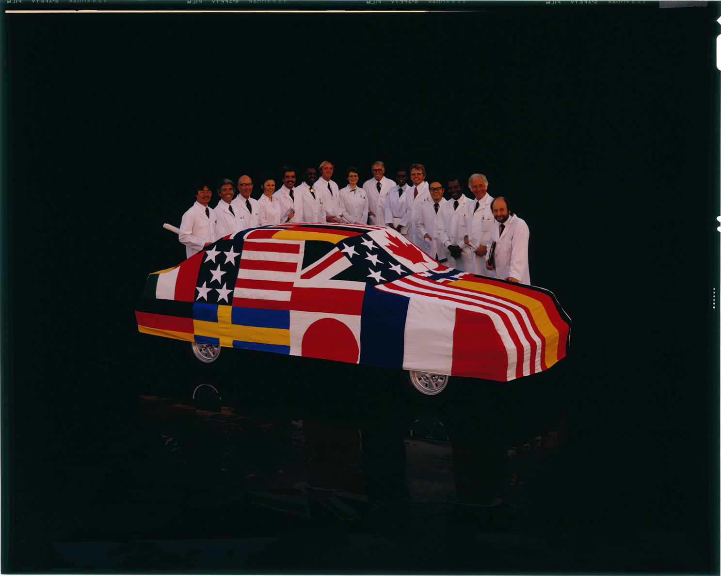 Favorite this☆ Advertisement for 1981 Ford Escort automobile Description: View of men and women, wearing lab coats, posing with a 1981 Ford Escort, which is covered with international flags. Label on sleeve: "Ford Motor Co., Ford Escort advertising, 1981." Details Resource ID: na035472 Creator: Boulevard Photographic (Firm) Subject: Escort automobile Advertising--Automobiles Transparencies Date Issued: 1981 Format: 1 transparency : col. ; 8 x 10 in. Member of: National Automotive History Collection Mickey McGuire and Jim Northmore Boulevard Photographic Collection Filing Location: Ford, 8:3 Rights: Physical rights are retained by DPL. Copyright is retained in accordance with U.S. copyright laws.