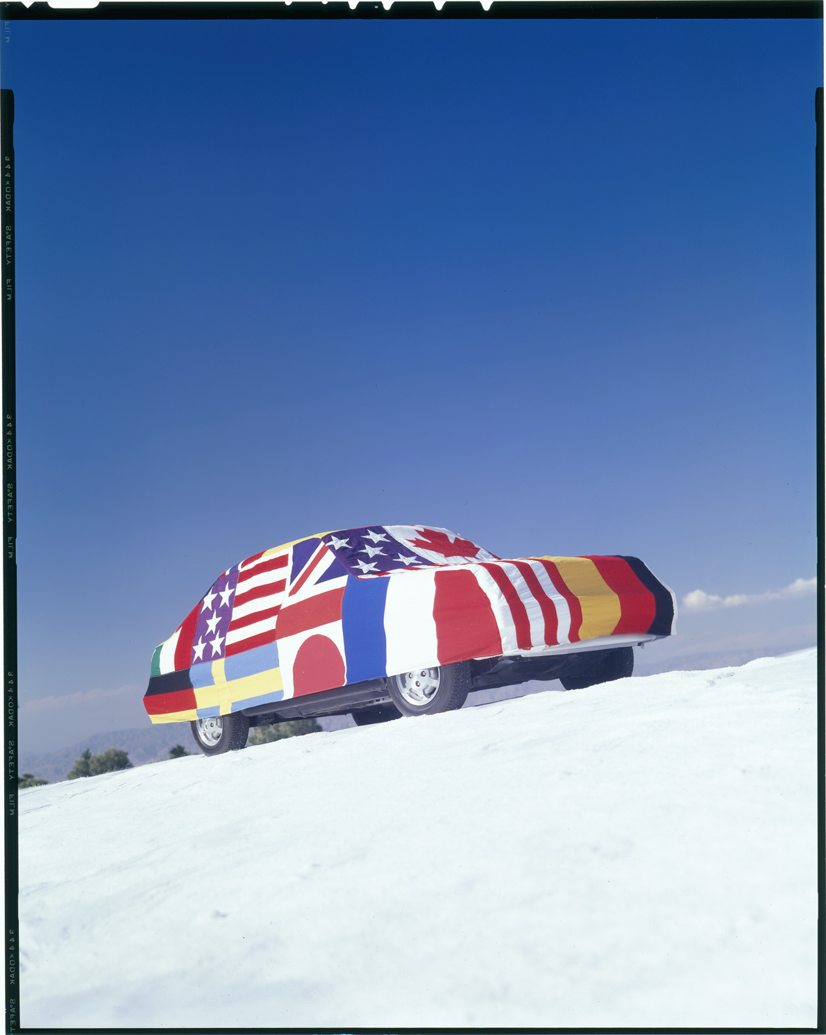 View of a 1981 Ford Escort car, covered with international flags. Label on sleeve: "Ford Motor Co., Ford Escort, 1981."