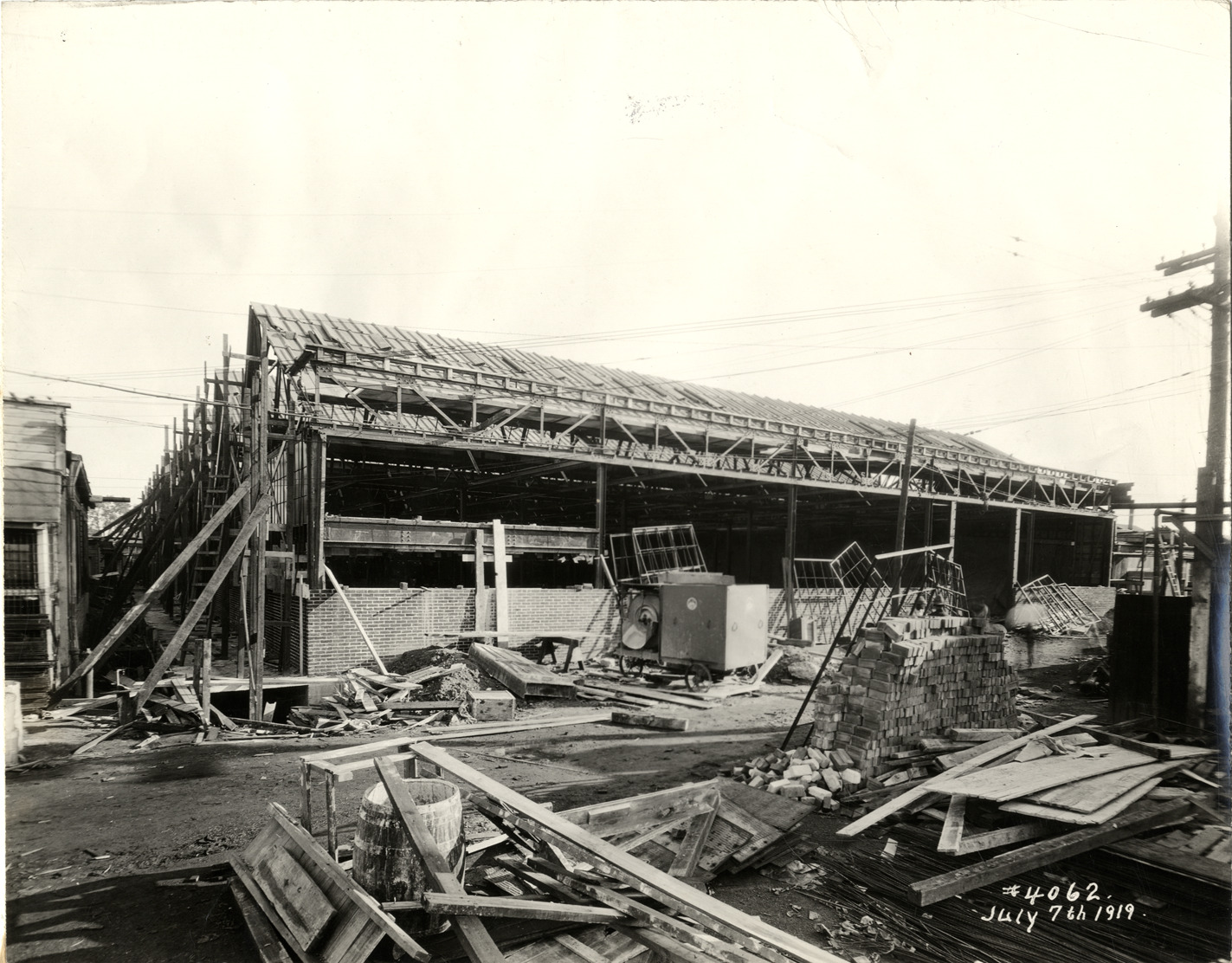 View of the Maxwell Motor Company factory during construction. Construction materials and debris in foreground. Printed on front: "July 7th, 1919." Stamped on back: "Manning Bros., commercial photographers, 22-24 Witherell St., Detroit, Michigan." Handwritten on back: "Factories--Maxwell."