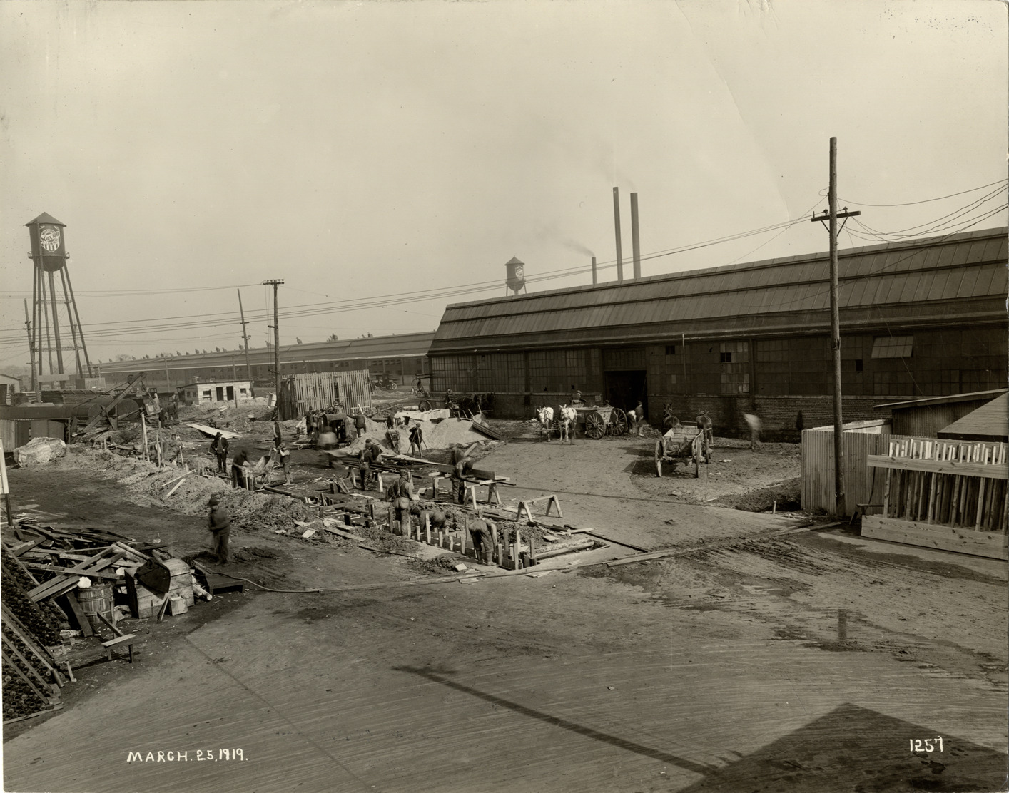 View of workers on the site of the Maxwell Motor Company factory during construction. Horse-drawn wagons in background. Printed on front: "March 25, 1919." Handwritten on back: "Factories--Maxwell."