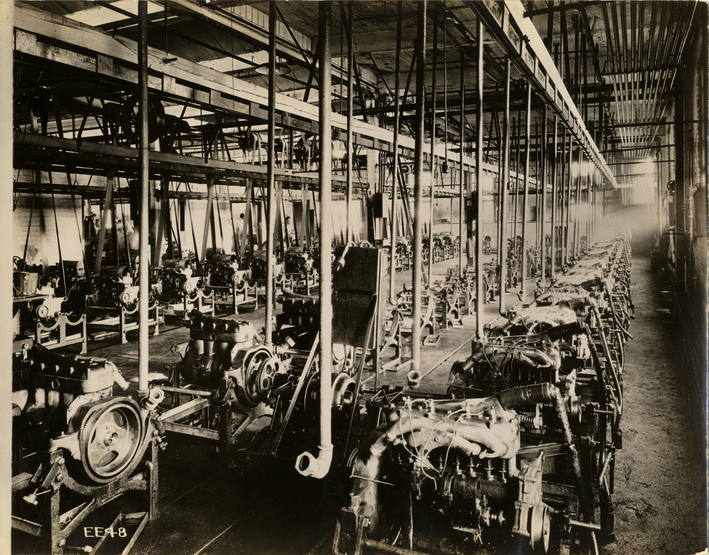 View of engine blocks on testing stands in the Maxwell Motor Company factory at Dayton, Ohio. Typed on back: "Dayton Plant. Motor block test." Handwritten on back: "Factories--Maxwell."