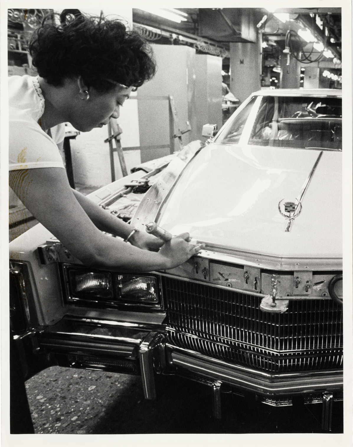 View of Mary Tipton applying accent stripes on a Cadillac automobile at Cadillac's Detroit assembly plant. Label on back: "Detroit. Did you ever wonder how those sporty accent stripes magically appear on a new Cadillac? They're applied in a unique manner, as shown by Mary Tipton, who performs one of the more artistic jobs in Cadillac's Detroit assembly plant. A large fixture with a gradually banked leading edge surround the area to be striped on each automobile. The stripe color is determined from a computerized option sheet, and the paint is applied from a large tube resembling a felt marking pen. The specially designed edge of the paint applicator is placed on the guiding edge of the fixture, and in less than one minute the employe [sic] directs the paint tube around the car, affixing the distinctive dual accent stripe. A special feature of this paint is that during the operation it can be wiped off and the paint stripe restarted at any point on the car. With more than 700 cars each day requiring accent stripes, Cadillac utilizes this quality technique which combines the individuality of craftsmanship with the flexibility, precision and speed of modern technology."