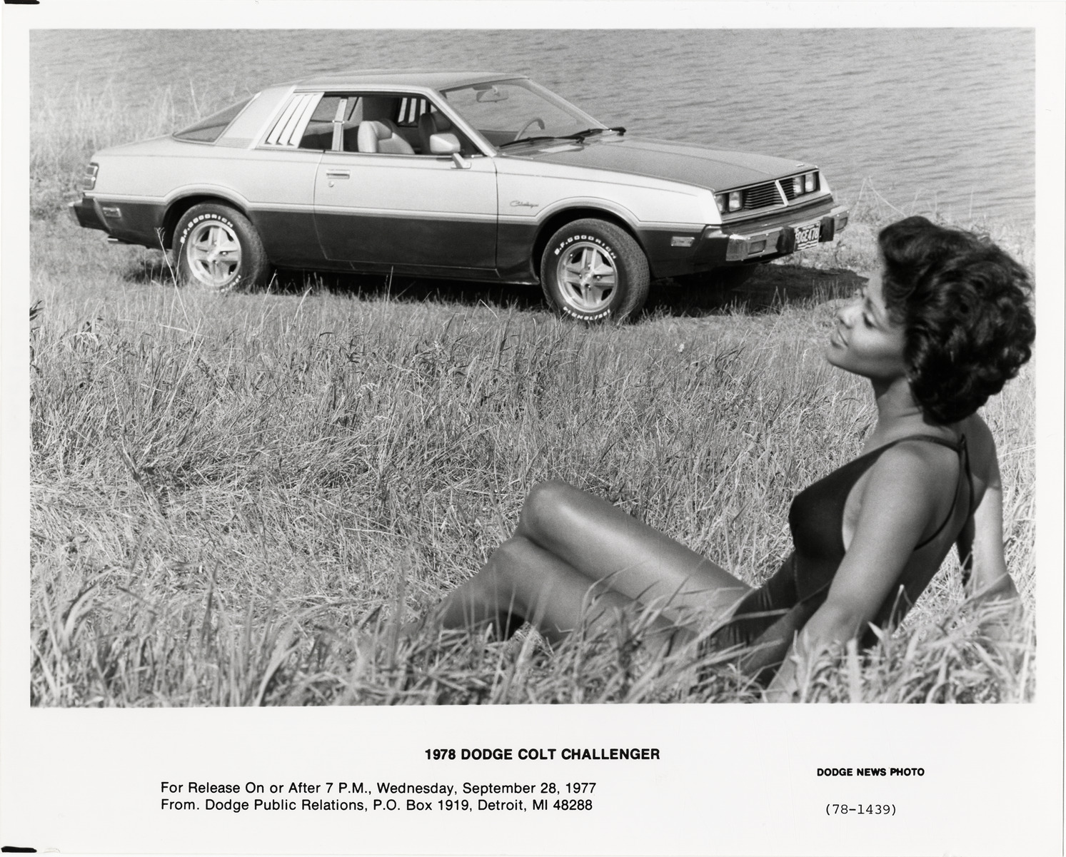 View of a woman posing with a 1978 Dodge Colt Challenger. Printed on front: "1978 Dodge Colt Challenger. For release on or after 7 p.m., Wednesday, September 28, 1977. From: Dodge Public Relations, P.O. Box 1919, Detroit, Michigan 48288 (78-1439). Dodge news photo."