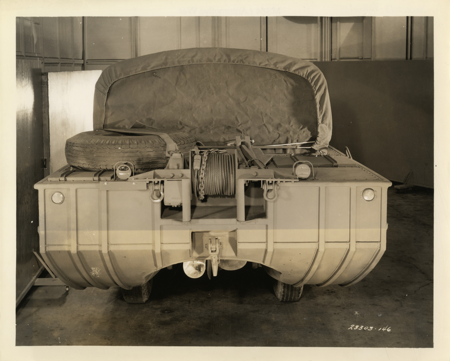 View of GMC amphibious truck (DUKW). Label on back: "By means of a power-driven winch, the amphibian truck can pull itself out of soft, sticky mud with astonishing ease. The winch cable is simply attached to a post, tree or any solid object on shore and the engine-driven winch does the rest. Unbelievable is the term used by engineers in describing the many accomplishments of this unique sea-going truck now being built by General Motors Truck and Coach. (Approved by the War Department, Bureau of Public Relations.)"