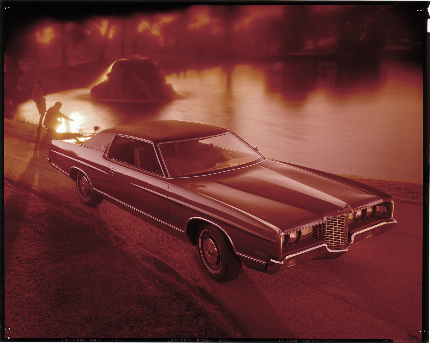 View of a man and woman posing with a 1971 Ford LTD coupe. Label on sleeve: "Ford Motor Co., Ford LTD, 1971."