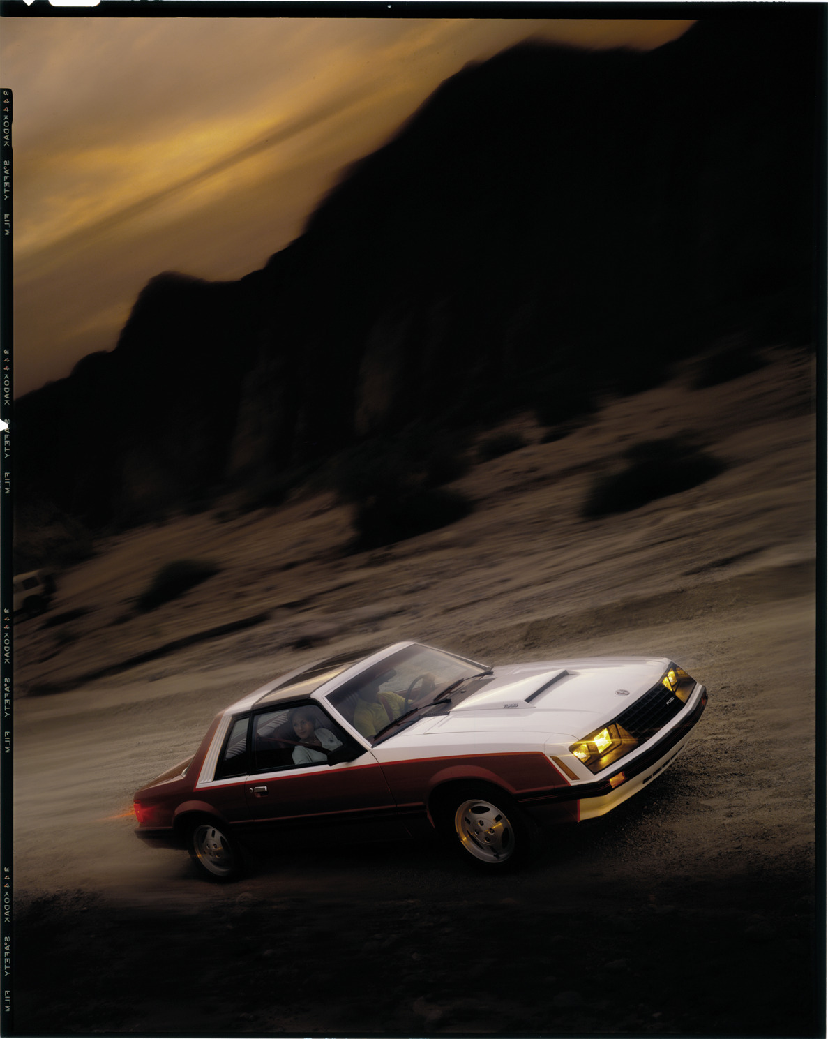 View of a man and woman in a Ford Mustang coupe. Label on sleeve: "Ford Motor Co., Ford Mustang, 1979-80."