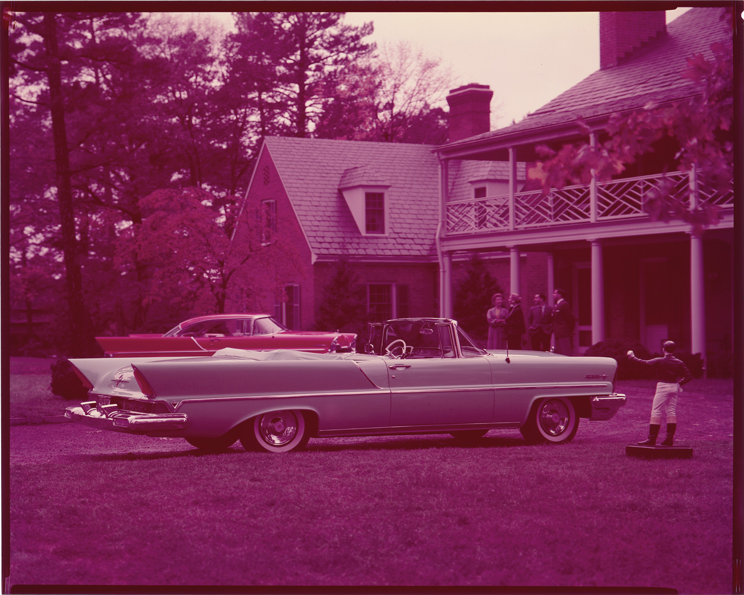 View of a 1957 Lincoln Premiere convertible. Men and women stand in front of brick house; another car in background. Label on sleeve: "Ford Motor Co., Lincoln convertible, 1957."