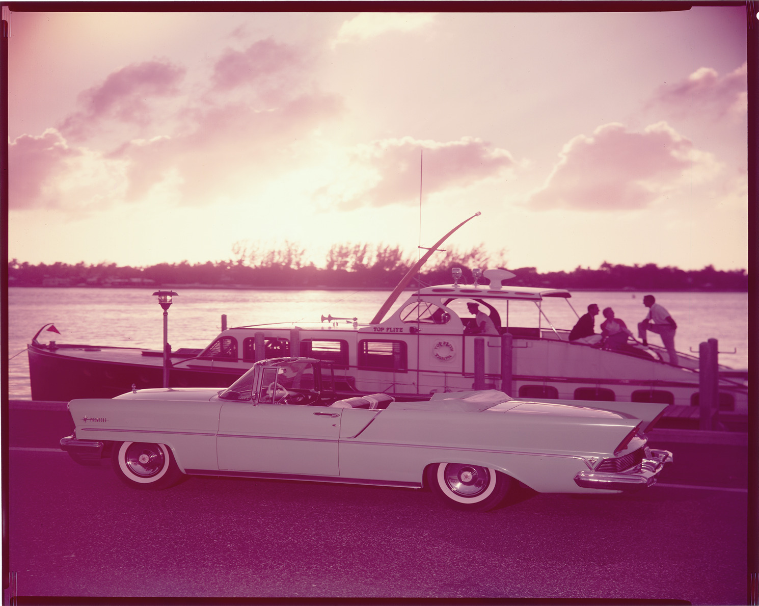 View of a 1957 Lincoln Premiere convertible parked on a dock. Yacht in background. Label on sleeve: "Ford Motor Co., Lincoln Premiere convertible, 1957."