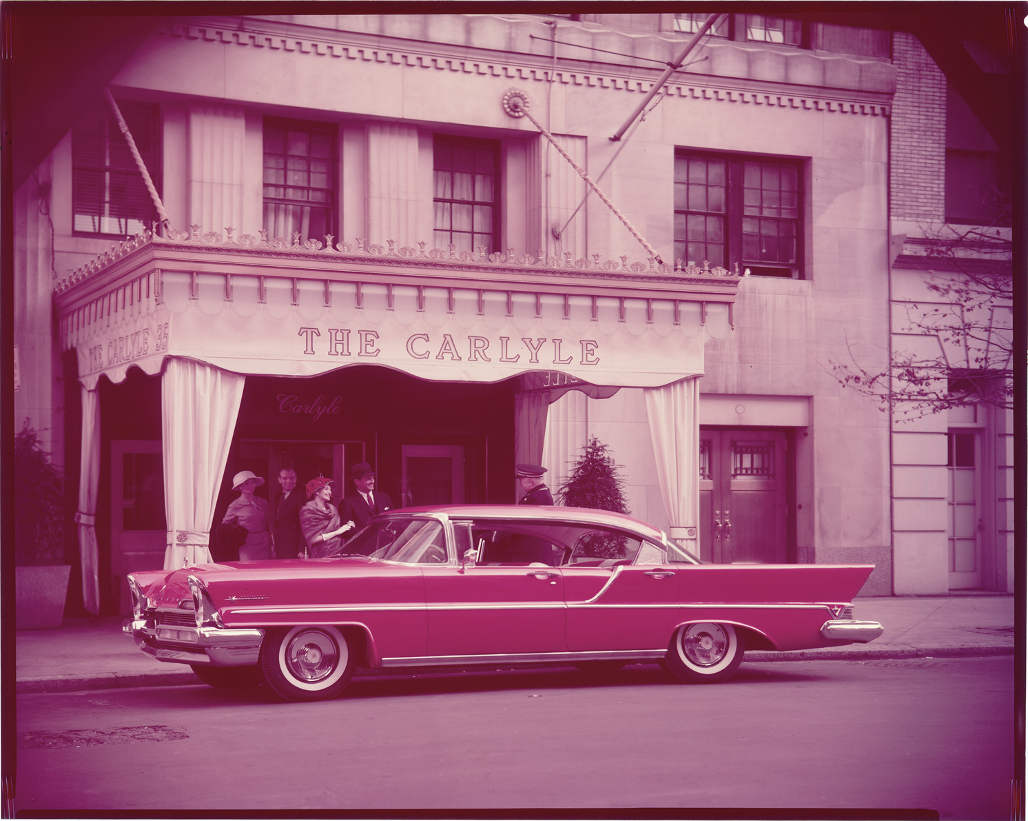View of a 1957 Lincoln Premiere sedan. Men and women stand in front of entrance to the Carlyle hotel in background; doorman stands next to car. Label on sleeve: "Ford Motor Co., Lincoln Premiere, 1957."