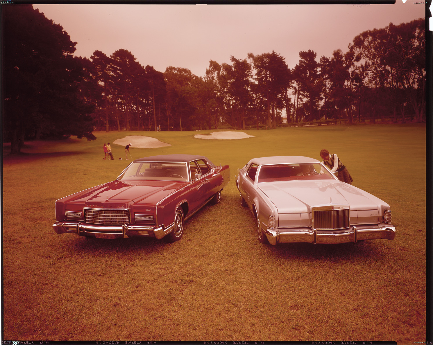 View of a 1973 Lincoln Continental sedan and a 1973 Lincoln Continental Mark IV coupe on a golf course. Label on sleeve: "Ford Motor Co., Lincoln, 1. Continental, 2. Continental IV, 1973."