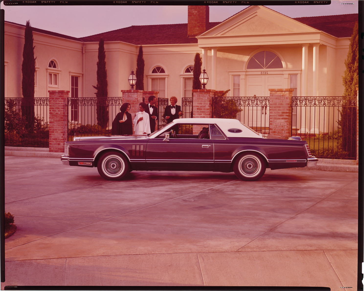 View of men and women posing with a 1977 Emilio Pucci edition Lincoln Continental Mark V coupe. House in background. Label on sleeve: "Ford Motor Co., Lincoln Pucci edition, Mark V, 1977."