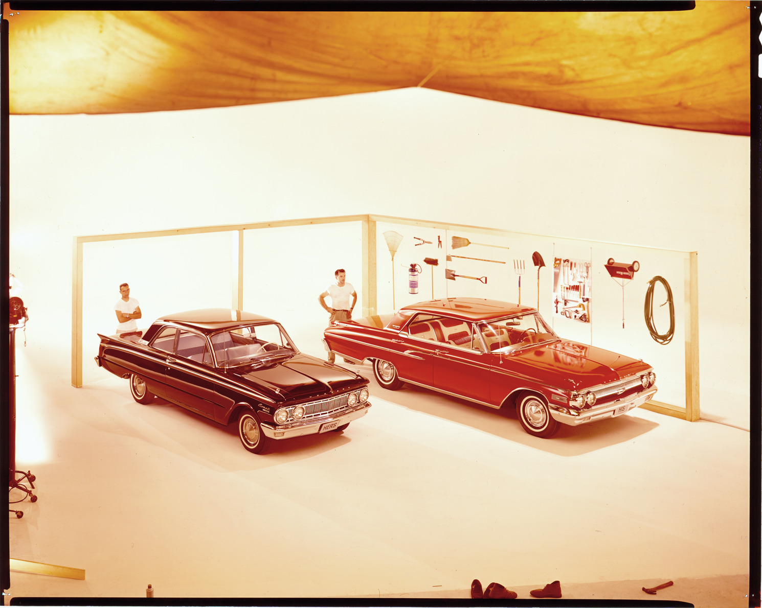 View of two men posing with a 1962 Mercury Comet coupe and a 1962 Mercury Monterey sedan in a simulated garage. Broom, rake, shovels, garden hose, fire extinguisher and other hand tools are displayed on wall. Label on sleeve: "Ford Motor Co., Mercury, 1. Comet, 2. Mercury, 1962."