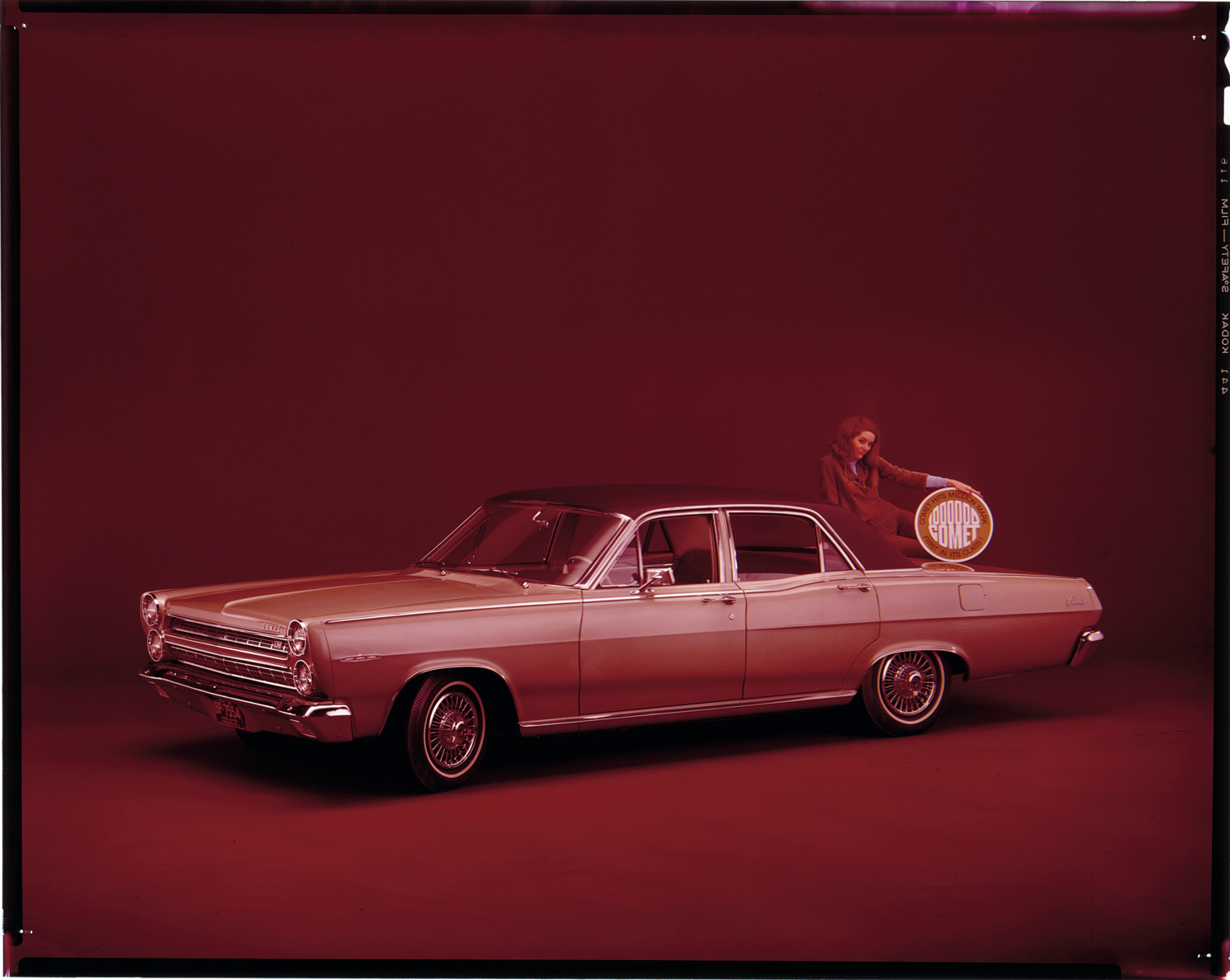 View of a woman posing with a 1966 Mercury Comet sedan. Woman holds a sign reading: "1,000,000 Comet. Comet hits million mark, first in its class!" Label on sleeve: "Ford Motor Co., Mercury Comet, 1966."