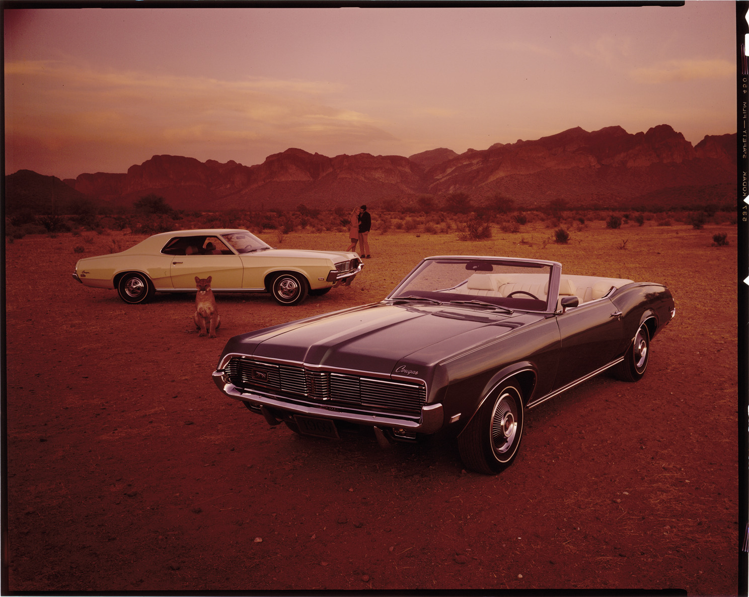 View of a man and woman posing with a 1969 Mercury Cougar coupe and a 1969 Mercury Cougar convertible. Cougar sits between cars. Label on sleeve: "Ford Motor Co., Mercury Cougar, conv., hdtp.,1969."