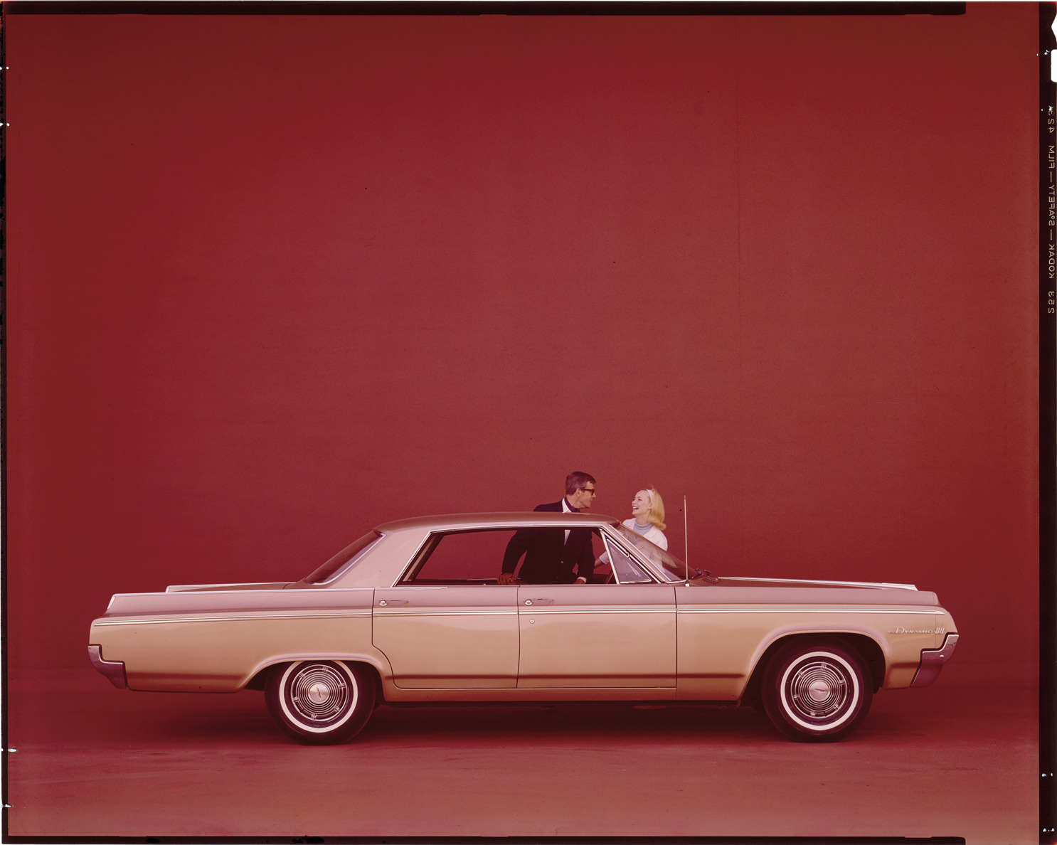 View of a man and woman posing with a 1964 Oldsmobile Dynamic 88 sedan. Label on sleeve: "General Motors, Oldsmobile, Dynamic 88, 1964."