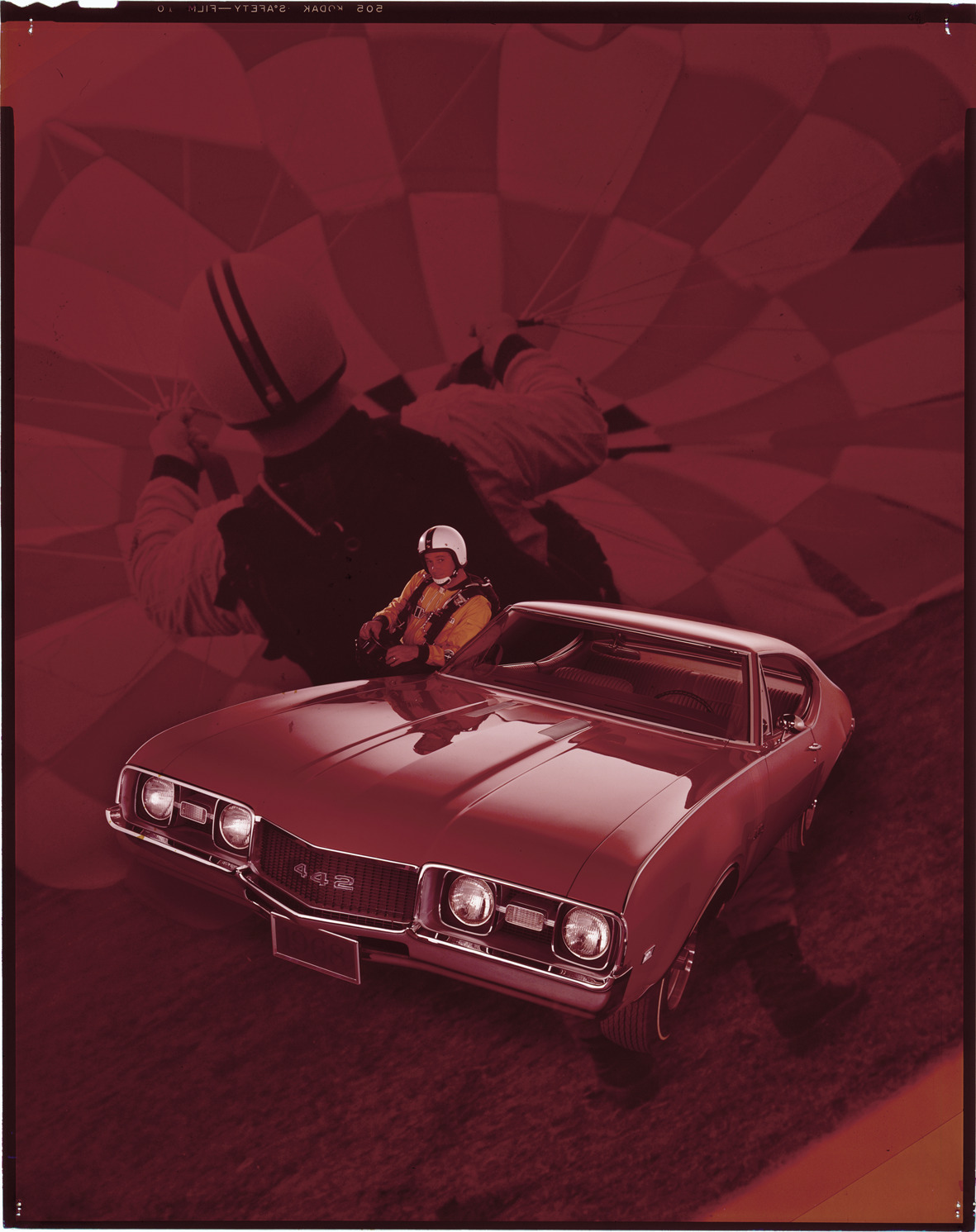 Favorite this☆ 1968 Oldsmobile 4-4-2 automobile Description: View of a parachute jumper posing with a 1968 Oldsmobile 442 coupe. Image of man with parachute in background. Label on sleeve: "General Motors, Oldsmobile 4-4-2, 1968." Details Resource ID: na036316 Creator: Boulevard Photographic (Firm) Subject: Oldsmobile automobile Advertising--Automobiles Transparencies Date Issued: 1968 Format: 1 transparency : col. ; 10 x 8 in. Member of: National Automotive History Collection Mickey McGuire and Jim Northmore Boulevard Photographic Collection Filing Location: Oldsmobile, 11:7 Rights: Physical rights are retained by DPL. Copyright is retained in accordance with U.S. copyright laws.