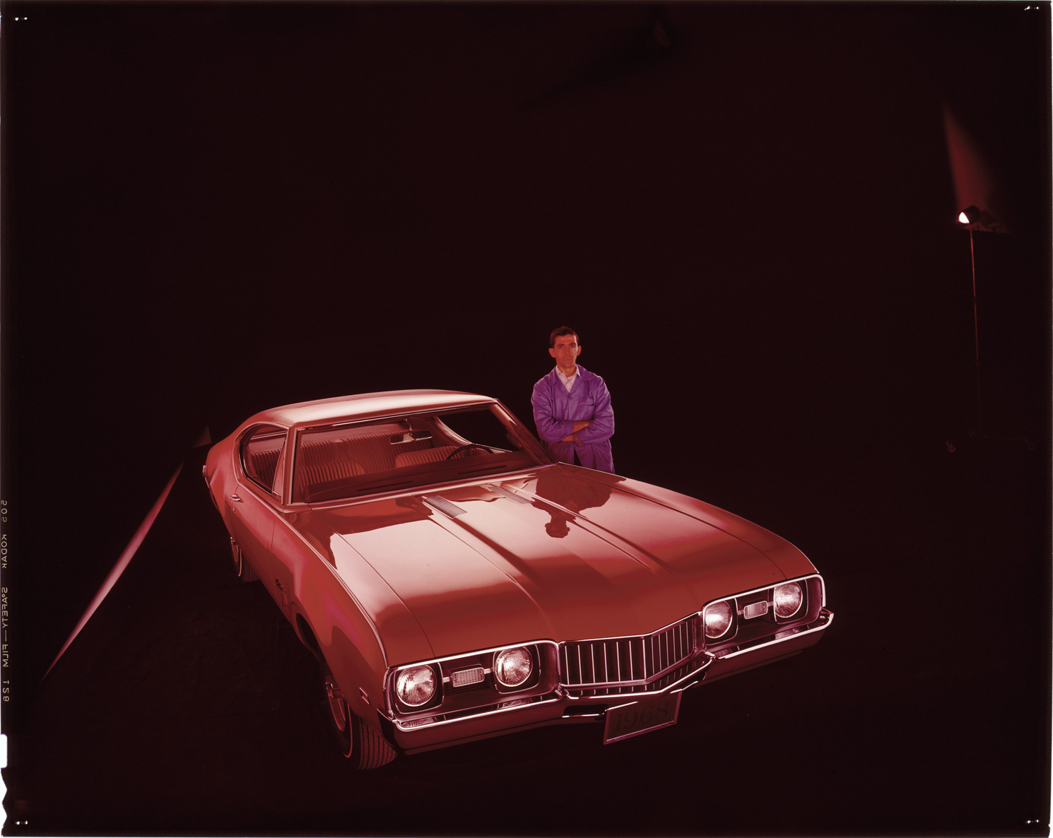 View of a man posing with a 1968 Oldsmobile Cutlass coupe. Label on sleeve: "General Motors, Oldsmobile Cutlass, 1968."