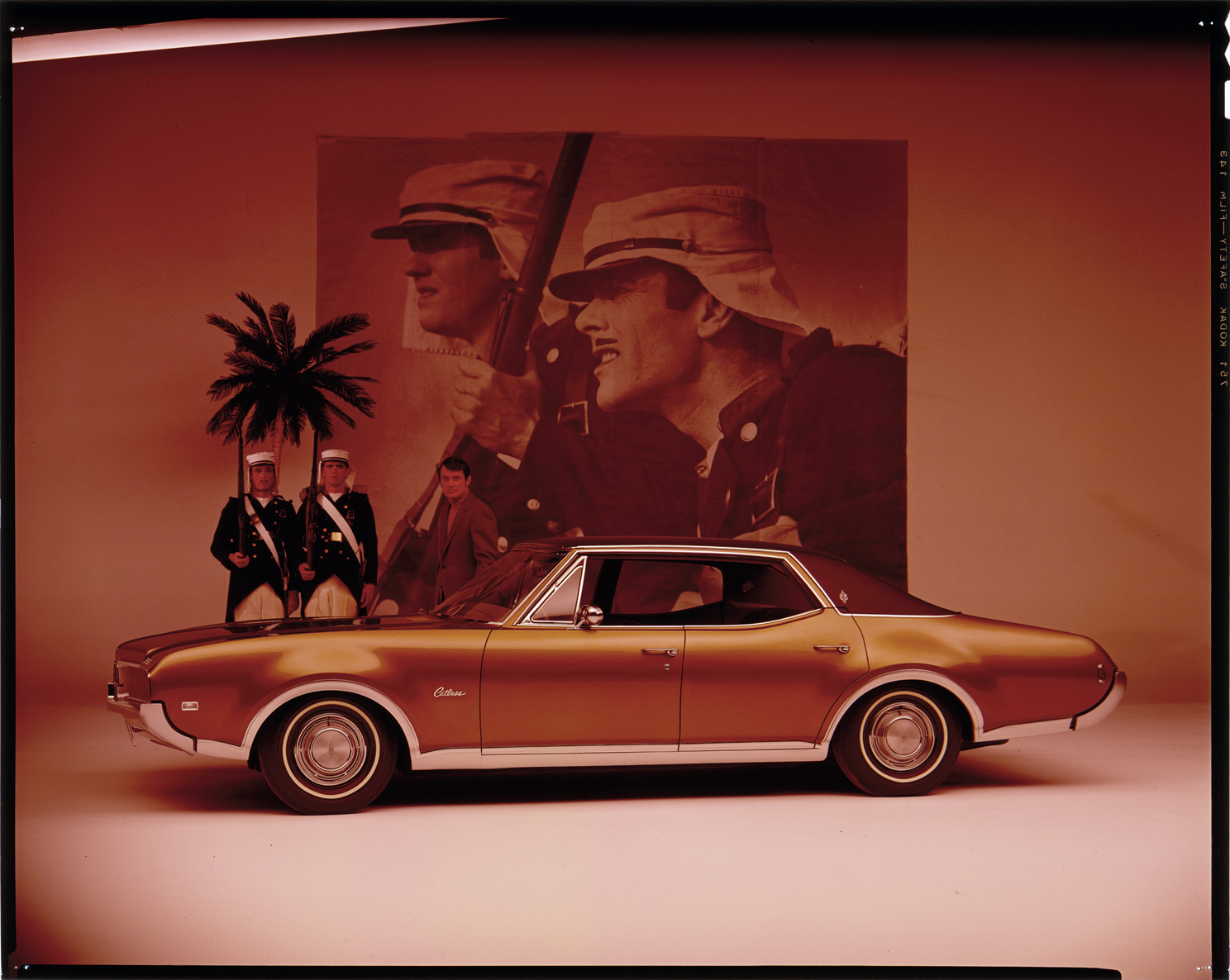 Favorite this☆ 1969 Oldsmobile Cutlass automobile Description: View of a man posing with a 1969 Oldsmobile Cutlass sedan. Two soldiers, palm tree and a film still of soldiers in background. Label on sleeve: "General Motors, Oldsmobile, Cutlass, 1969." Details Resource ID: na036332 Creator: Boulevard Photographic (Firm) Subject: Cutlass automobile Soldiers Advertising--Automobiles Transparencies Date Issued: 1969 Format: 1 transparency : col. ; 8 x 10 in. Member of: National Automotive History Collection Mickey McGuire and Jim Northmore Boulevard Photographic Collection Filing Location: Oldsmobile, 11:7 Rights: Physical rights are retained by DPL. Copyright is retained in accordance with U.S. copyright laws.