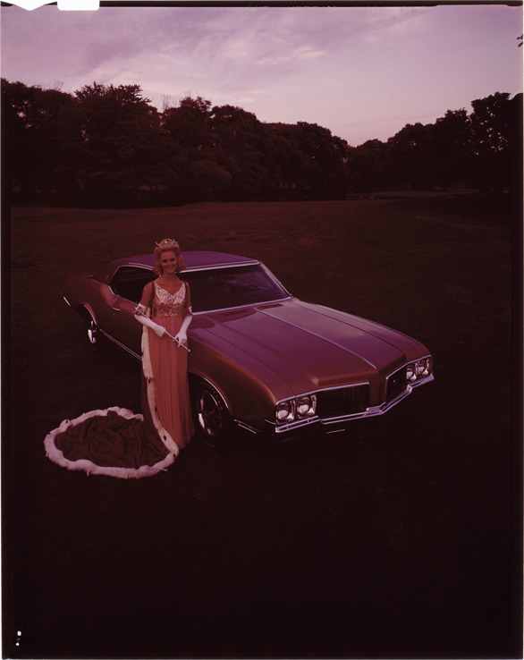 View of Pam Eldred, Miss America 1970, posing with a 1970 Oldsmobile Cutlass Supreme coupe. Label on sleeve: "General Motors, Oldsmobile, Cutlass Supreme, Miss America, Pam Eldred, 1970."