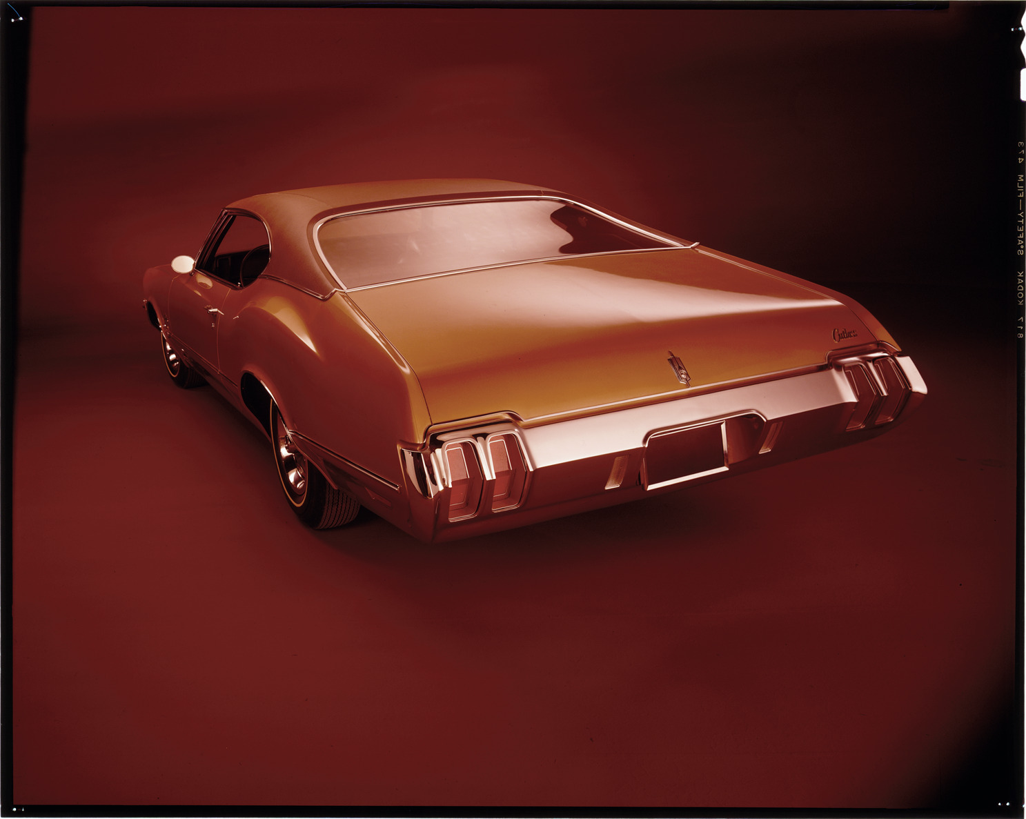 View of a 1970 Oldsmobile Cutlass coupe. Label on sleeve: "General Motors, Oldsmobile Cutlass, 1970."