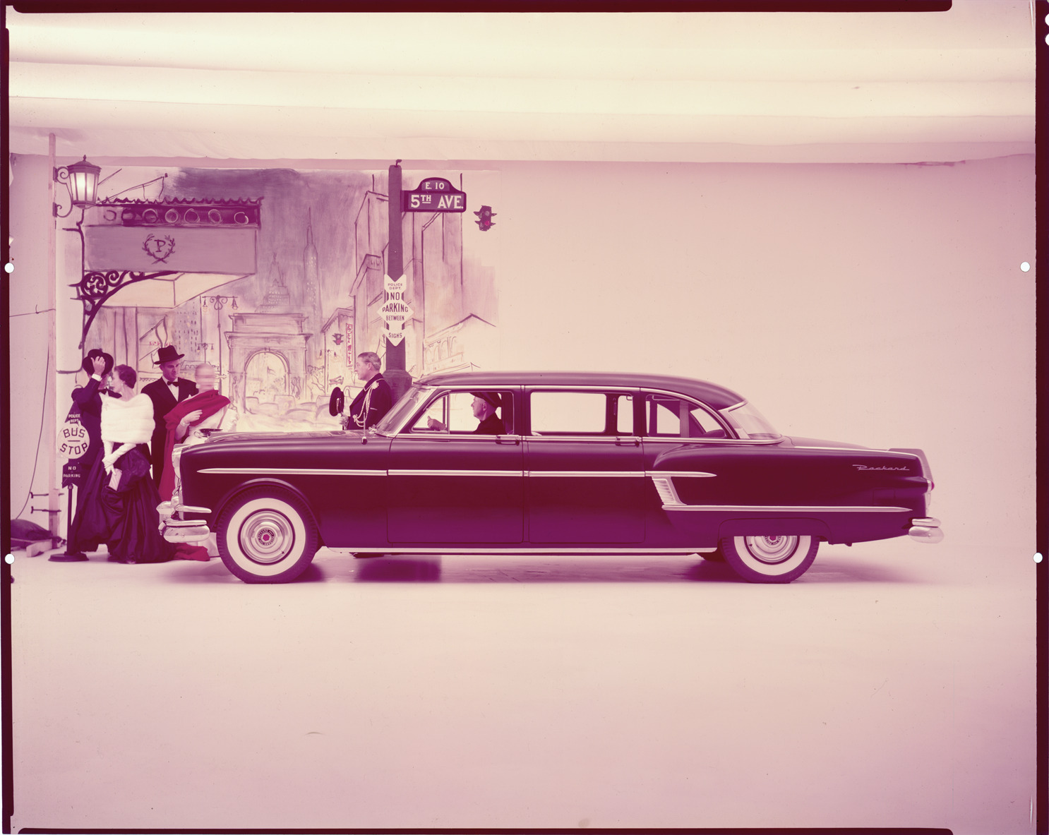 Favorite this☆ 1954 Packard automobile Description: View of men, women and a doorman posing with a 1954 Packard sedan. Illustration of a New York city street in background. Label on sleeve: "Packard, 1954." Details Resource ID: na036442 Creator: Boulevard Photographic (Firm) Subject: Packard automobile Advertising--Automobiles Transparencies Date Issued: 1954 Format: 1 transparency : col. ; 8 x 10 in. Member of: National Automotive History Collection Mickey McGuire and Jim Northmore Boulevard Photographic Collection Filing Location: Packard, 12:3 Rights: Physical rights are retained by DPL. Copyright is retained in accordance with U.S. copyright laws.