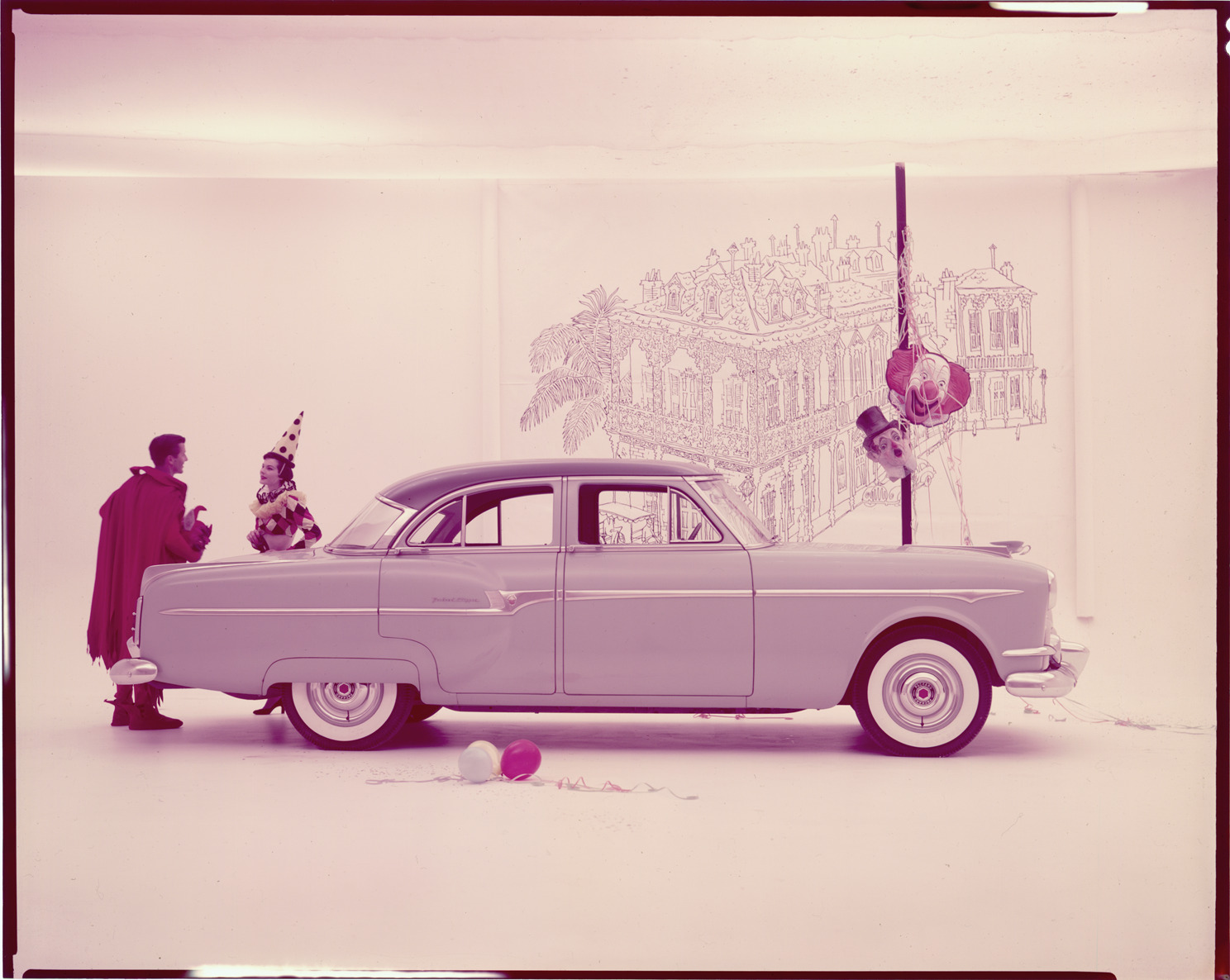 Favorite this☆ 1954 Packard Clipper automobile Description: View of a woman, costumed as a clown, and a man, costumed as a devil, posing with a 1954 Packard Clipper sedan. Masks and an illustration of buildings in background. Label on sleeve: "Packard, 1954." Details Resource ID: na036449 Creator: Boulevard Photographic (Firm) Subject: Packard automobile Clowns Devil Advertising--Automobiles Transparencies Date Issued: 1954 Format: 1 transparency : col. ; 8 x 10 in. Member of: National Automotive History Collection Mickey McGuire and Jim Northmore Boulevard Photographic Collection Filing Location: Packard, 12:3 Rights: Physical rights are retained by DPL. Copyright is retained in accordance with U.S. copyright laws.