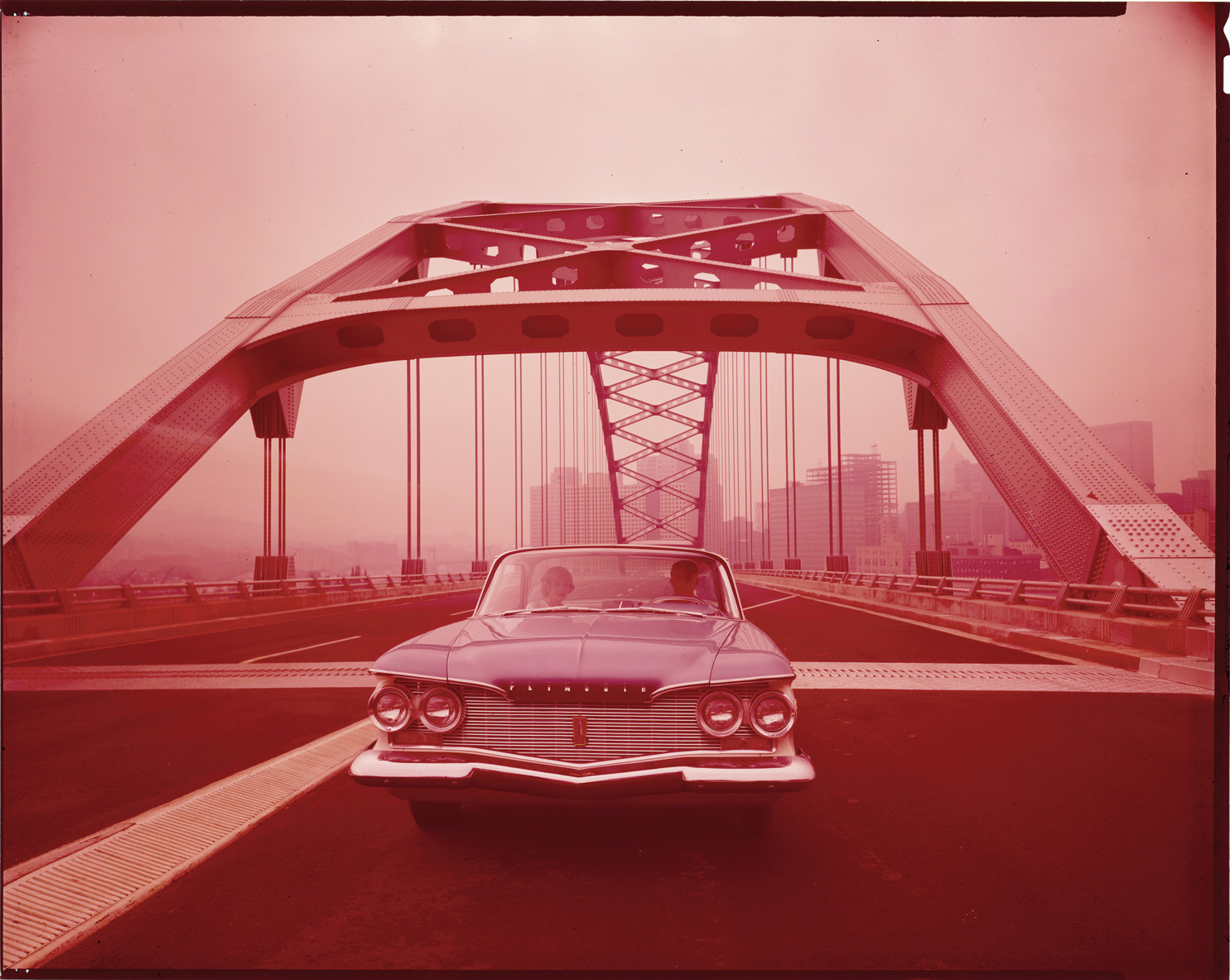 Front view of a man and woman in a 1960 Plymouth Fury automobile, crossing a bridge. Label on sleeve: "Chrysler Corp., Plymouth, front end, 1960."