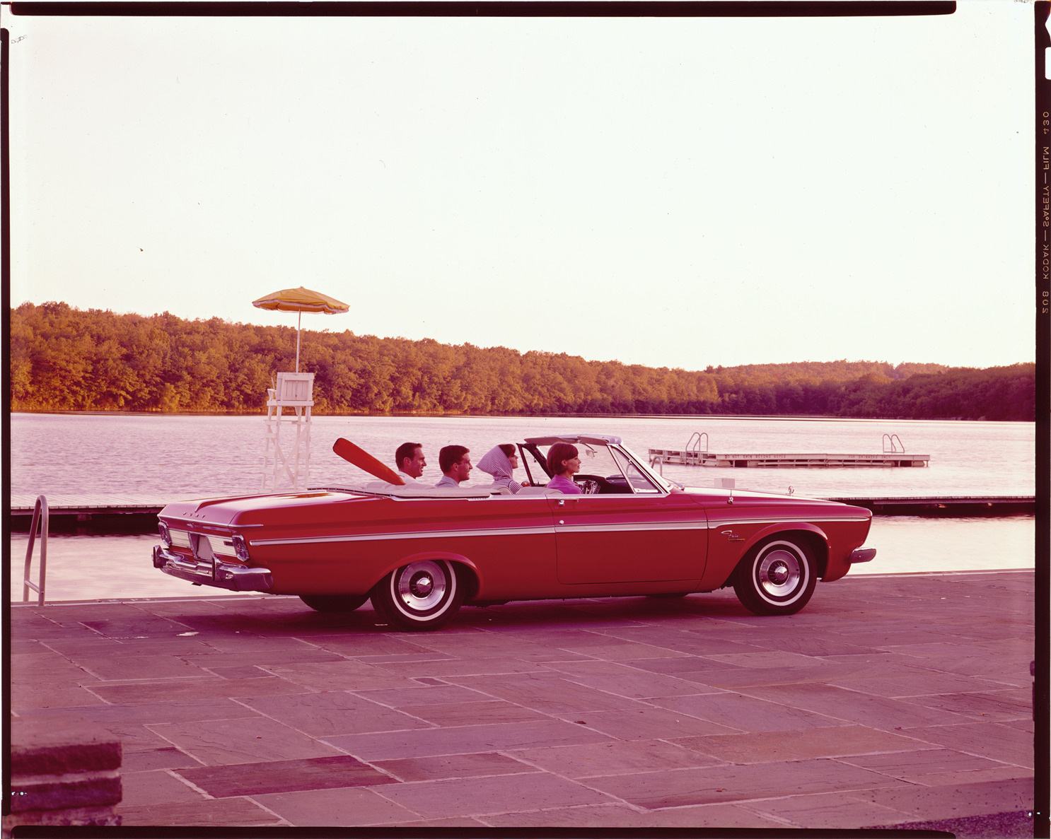 View of men and women posing in a 1963 Plymouth Fury convertible next to a lake. Lifeguard station and umbrella in background. Label on sleeve: "Chrysler Corp., Plymouth Fury convertible, 1963."