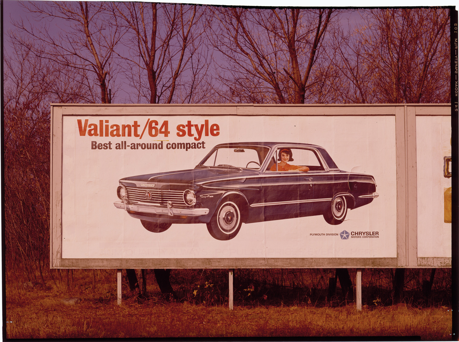 View of a billboard advertising a 1964 Plymouth Valiant Signet coupe. Billboard depicts a woman in a 1964 Plymouth Valiant Signet coupe with the text: "Valiant/64 style. Best all-around compact. Plymouth Division, Chrysler Motors Corporation." Label on sleeve: "Chrysler Corp., Plymouth Valiant, outdoor advertising, 1964."