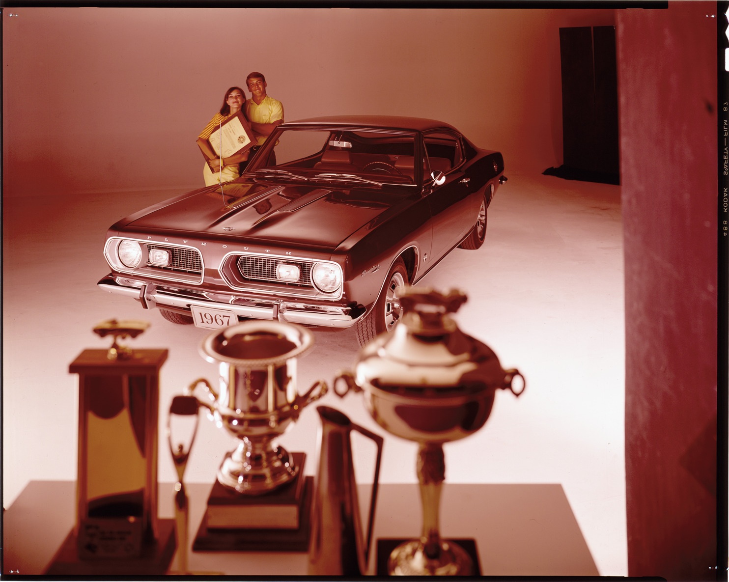 Favorite this☆ 1967 Plymouth Barracuda automobile Description: View of a man and woman posing with a 1967 Plymouth Barracuda coupe. Woman holds plaque; trophies in foreground. Label on sleeve: "Chrysler Corp., Plymouth Barracuda, 1967." Details Resource ID: na036570 Creator: Boulevard Photographic (Firm) Subject: Barracuda automobile Advertising--Automobiles Transparencies Date Issued: 1967 Format: 1 transparency : col. ; 8 x 10 in. Member of: National Automotive History Collection Mickey McGuire and Jim Northmore Boulevard Photographic Collection Filing Location: Plymouth, 12:9 Rights: Physical rights are retained by DPL. Copyright is retained in accordance with U.S. copyright laws.