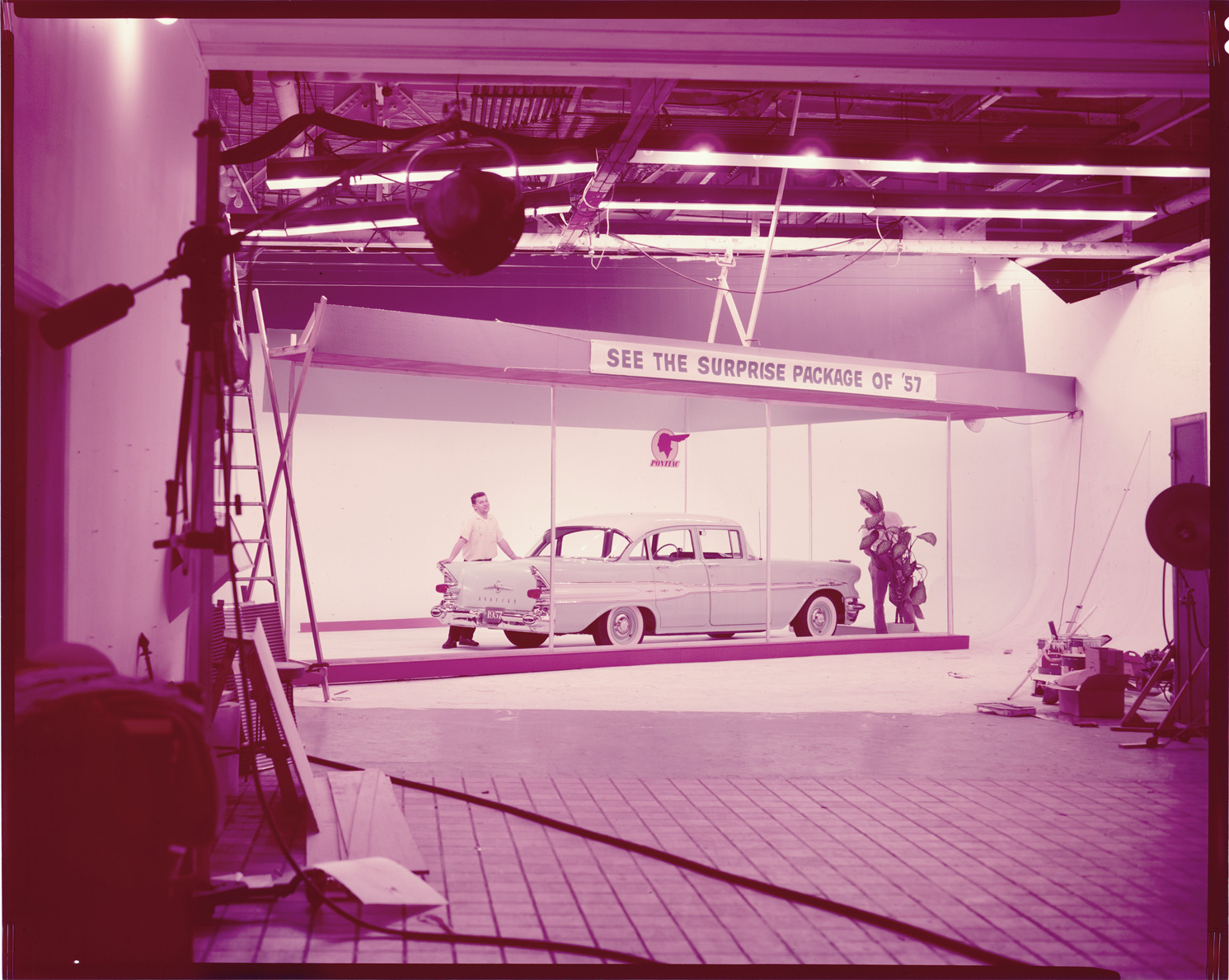 View of two men posing on set with a 1957 Pontiac Chieftain sedan. "See the surprise package of '57" sign is displayed overhead; Pontiac logo in background. Label on sleeve: "General Motors, Pontiac advertising, 1957."