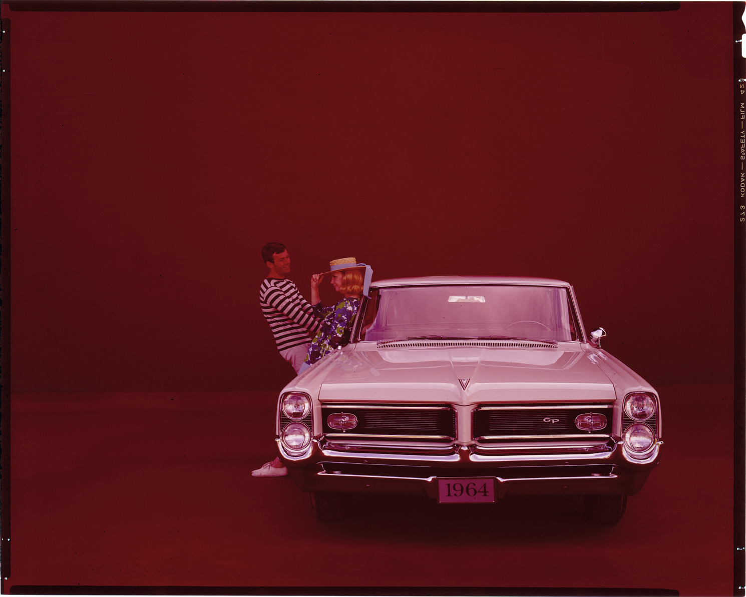View of a man and woman posing with a 1964 Pontiac Grand Prix coupe. Label on sleeve: "General Motors, Pontiac Grand Prix, 1964."