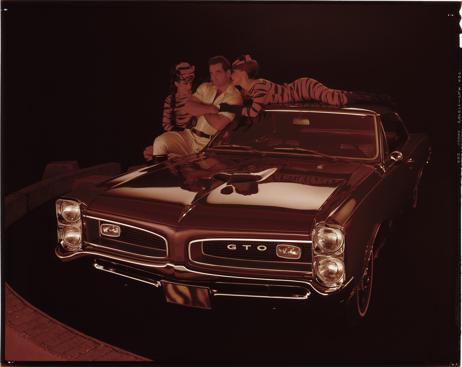 View of two women, costumed as tigers, and a man posing with a 1967 Pontiac GTO coupe. Label on sleeve: "General Motors, Pontiac GTO advertising, 1967."
