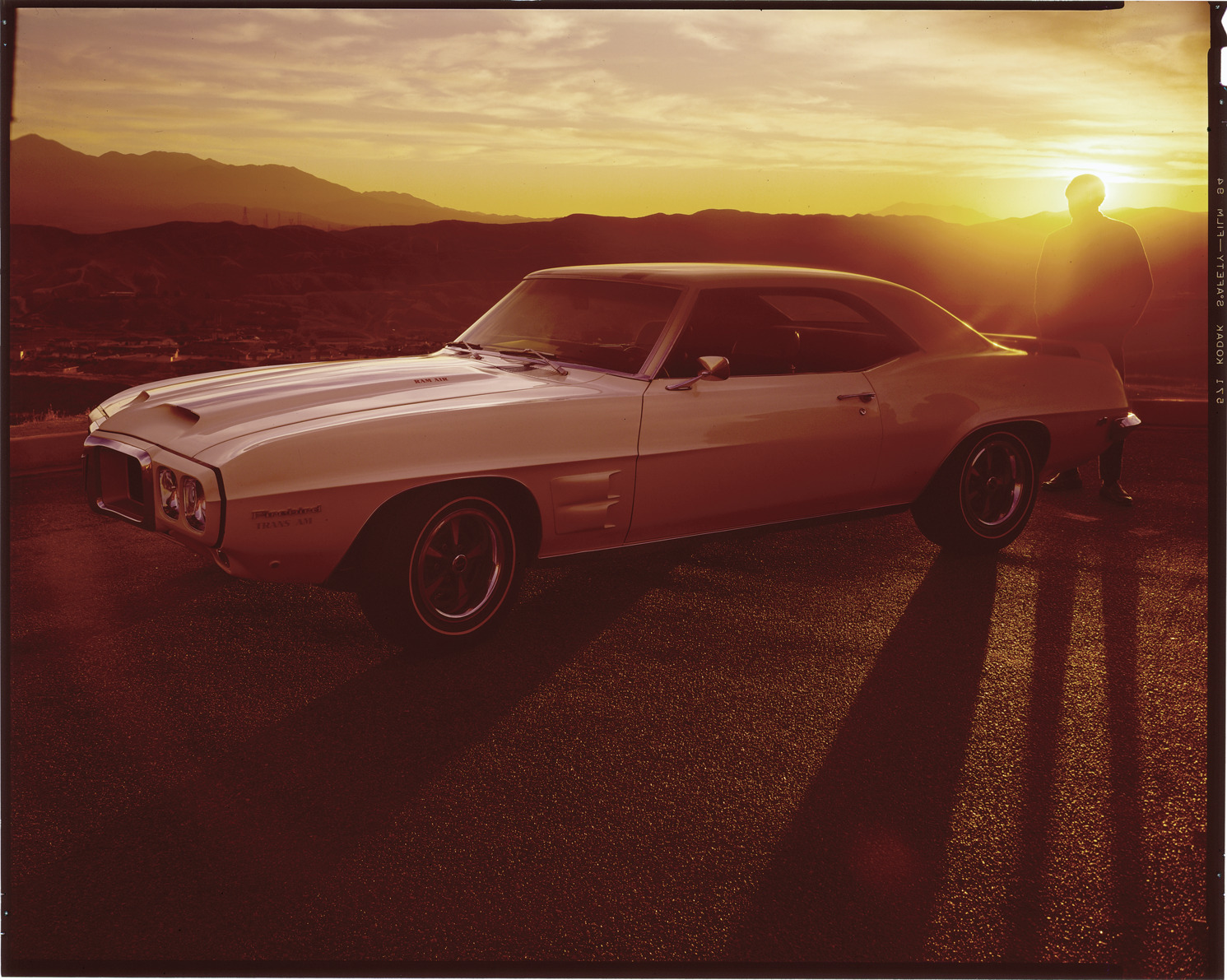 View of a man posing with a 1969 Pontiac Firebird coupe. Label on sleeve: "General Motors, Pontiac Firebird, 1969."