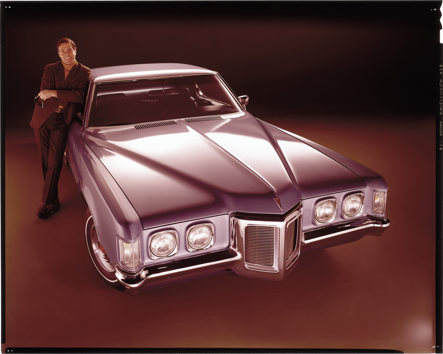 View of a man posing with a 1969 Pontiac Grand Prix coupe. Label on sleeve: "General Motors, Pontiac Grand Prix, 1969."
