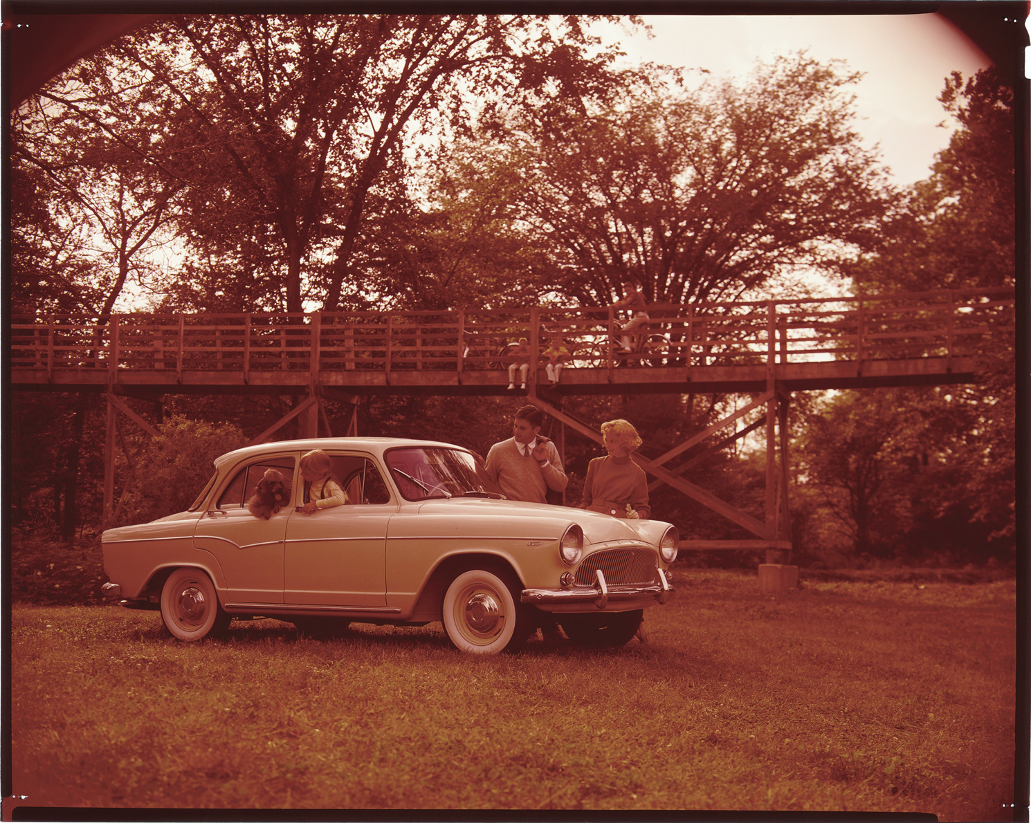 Favorite this☆ Simca automobile Description: View of a family posing with a Simca sedan. Children sit on bridge in background. Label on sleeve: "Simca, 1950s." Details Resource ID: na036792 Creator: Boulevard Photographic (Firm) Subject: Simca automobile Wooden bridges Advertising--Automobiles Transparencies Date Issued: Unknown year in the decade of the 1950s Format: 1 transparency : col. ; 8 x 10 in. Member of: National Automotive History Collection Mickey McGuire and Jim Northmore Boulevard Photographic Collection Filing Location: Simca, 13:13 Rights: Physical rights are retained by DPL. Copyright is retained in accordance with U.S. copyright laws.