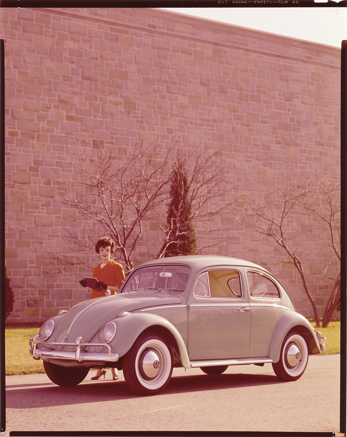 View of a woman posing with a 1963 Volkswagen Beetle coupe. Label on sleeve: "Volkswagen, 1963."