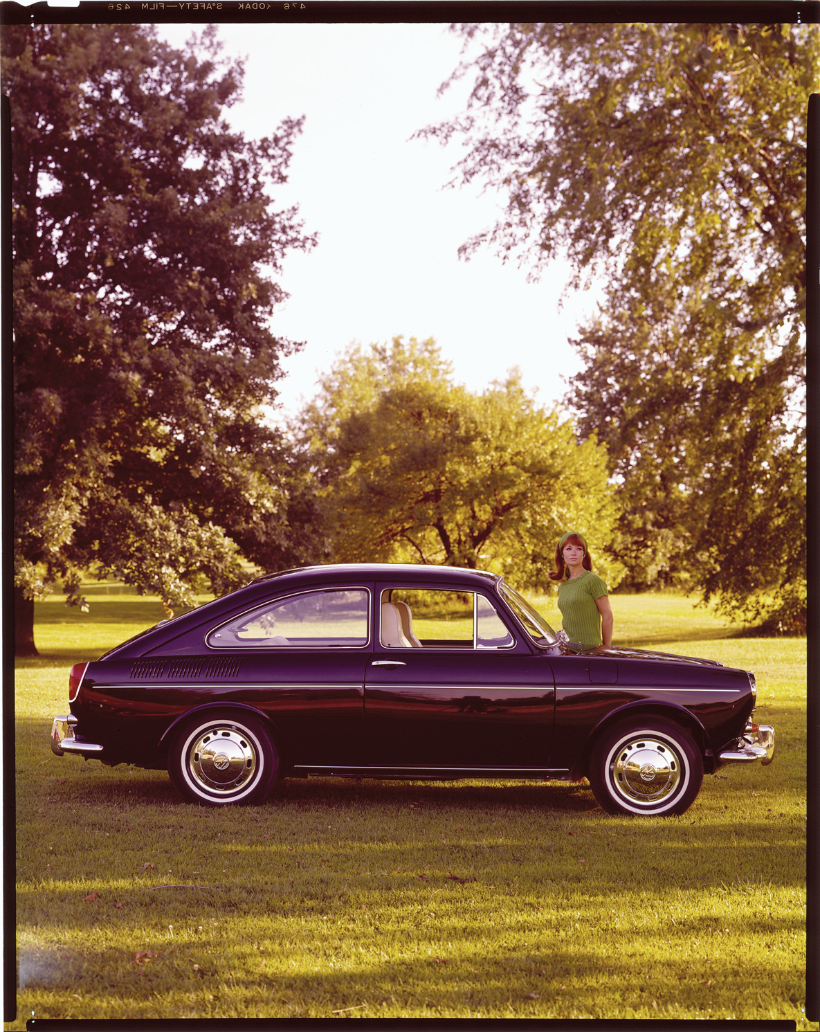View of a woman posing with a 1968 Volkswagen 1600 coupe. Label on sleeve: "Volkswagen 1600, 1968."