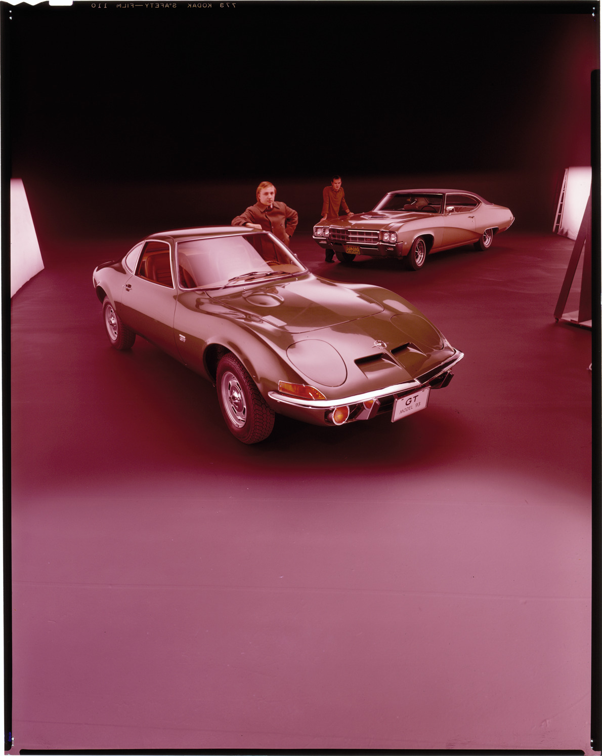 View of two men posing with a 1969 Buick GS coupe and a 1969 Opel GT coupe. Label on sleeve: "General Motors, Opel GT/Buick GS, 1969."