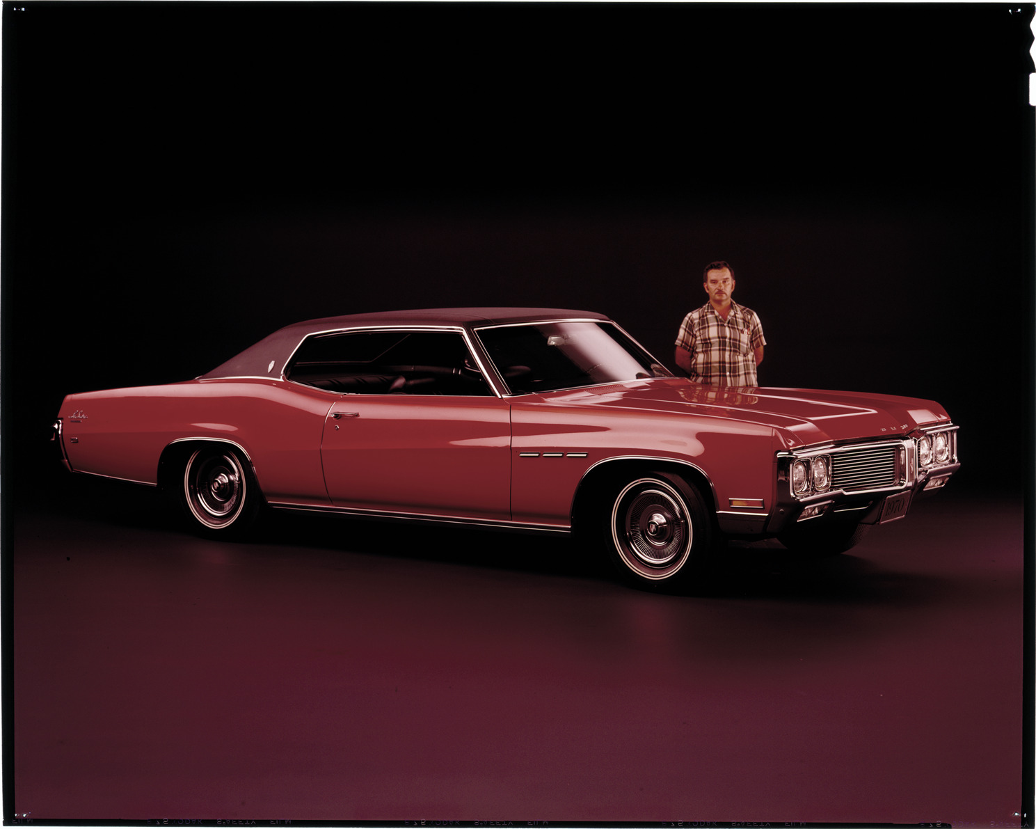 View of man posing with a 1970 Buick LeSabre coupe. Label on sleeve: "General Motors, Buick LeSabre, 1970."